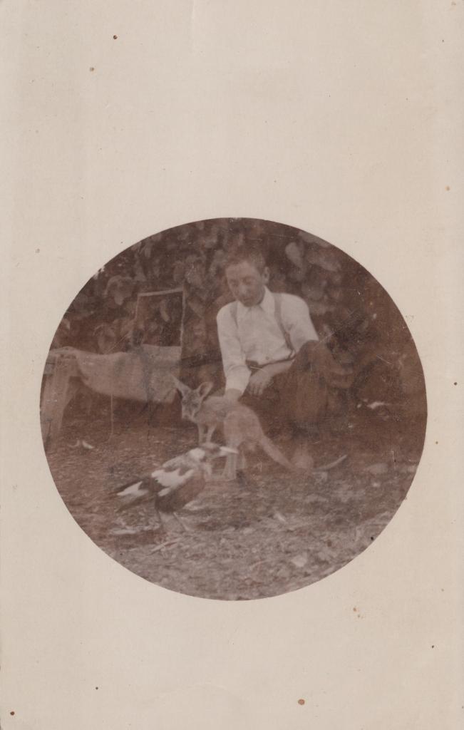 c. 1913Postcard showing Alf Congdon crouching next to a small cangaroo.