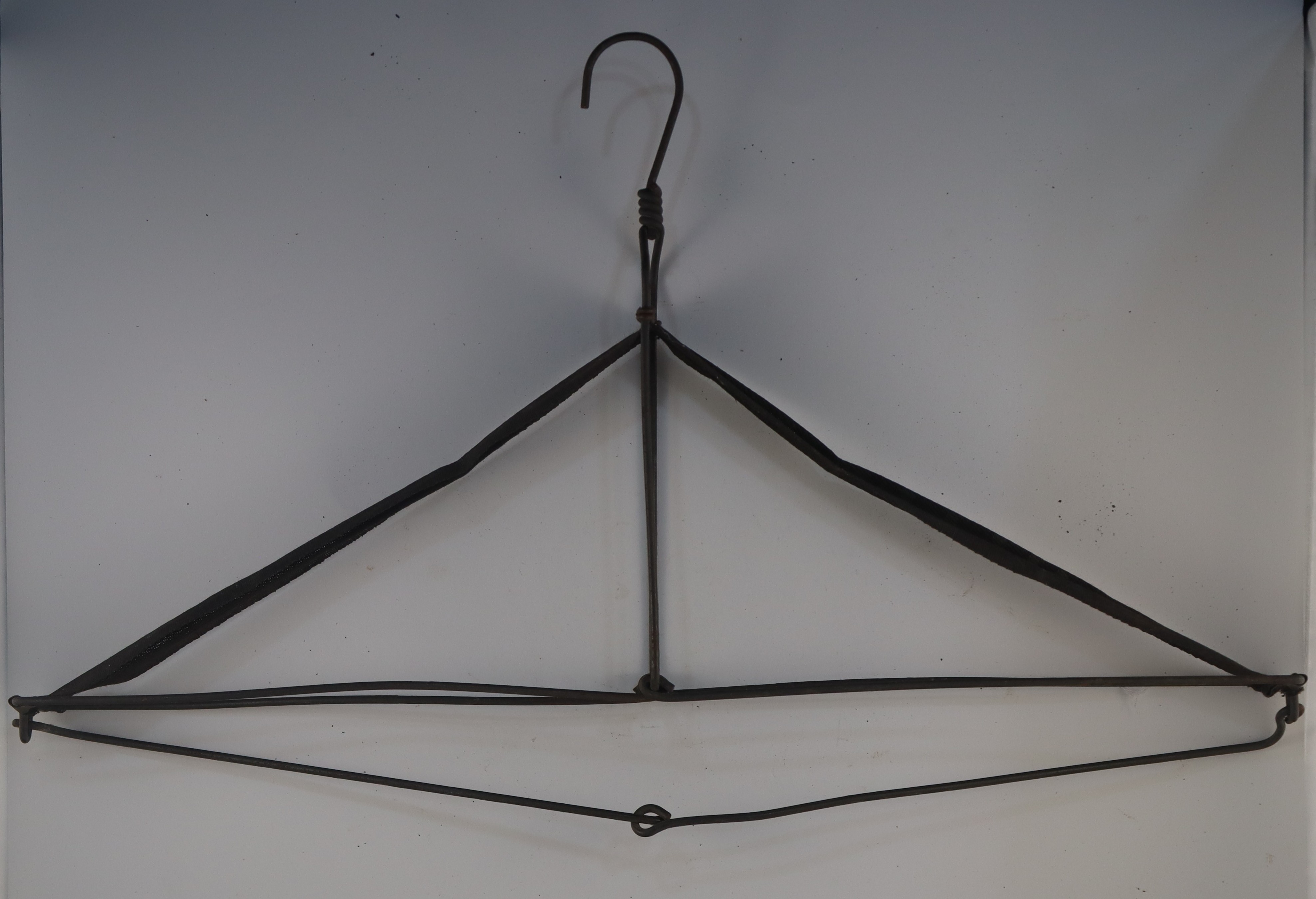 c. 1910A foldable metal coat hanger with ribbon on the edges that clothes hang off and a bottom railing to hold another piece of clothing.
