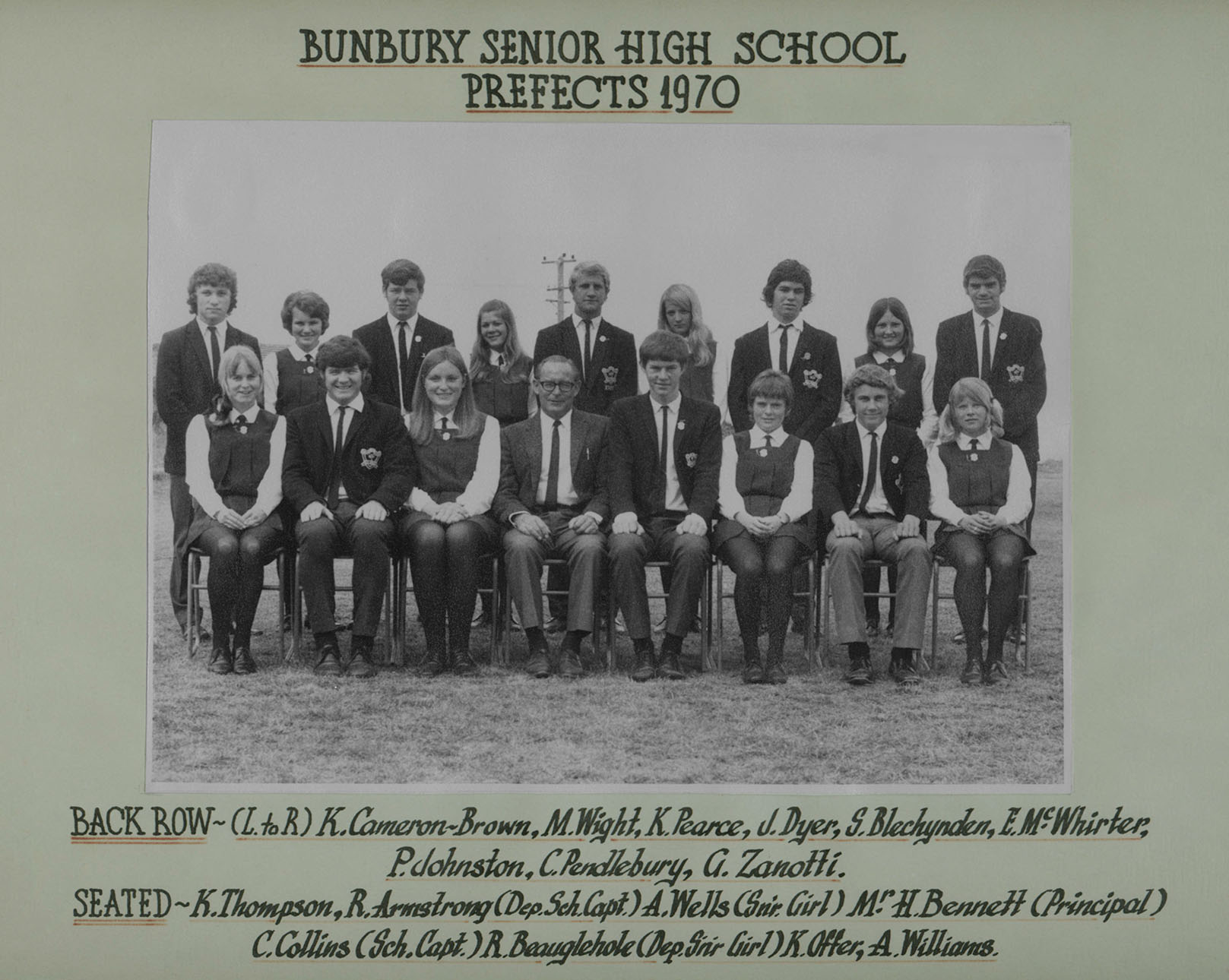 1970Group photograph of the 1970 Bunbury Senior High Prefects with principal Harry Bennett.