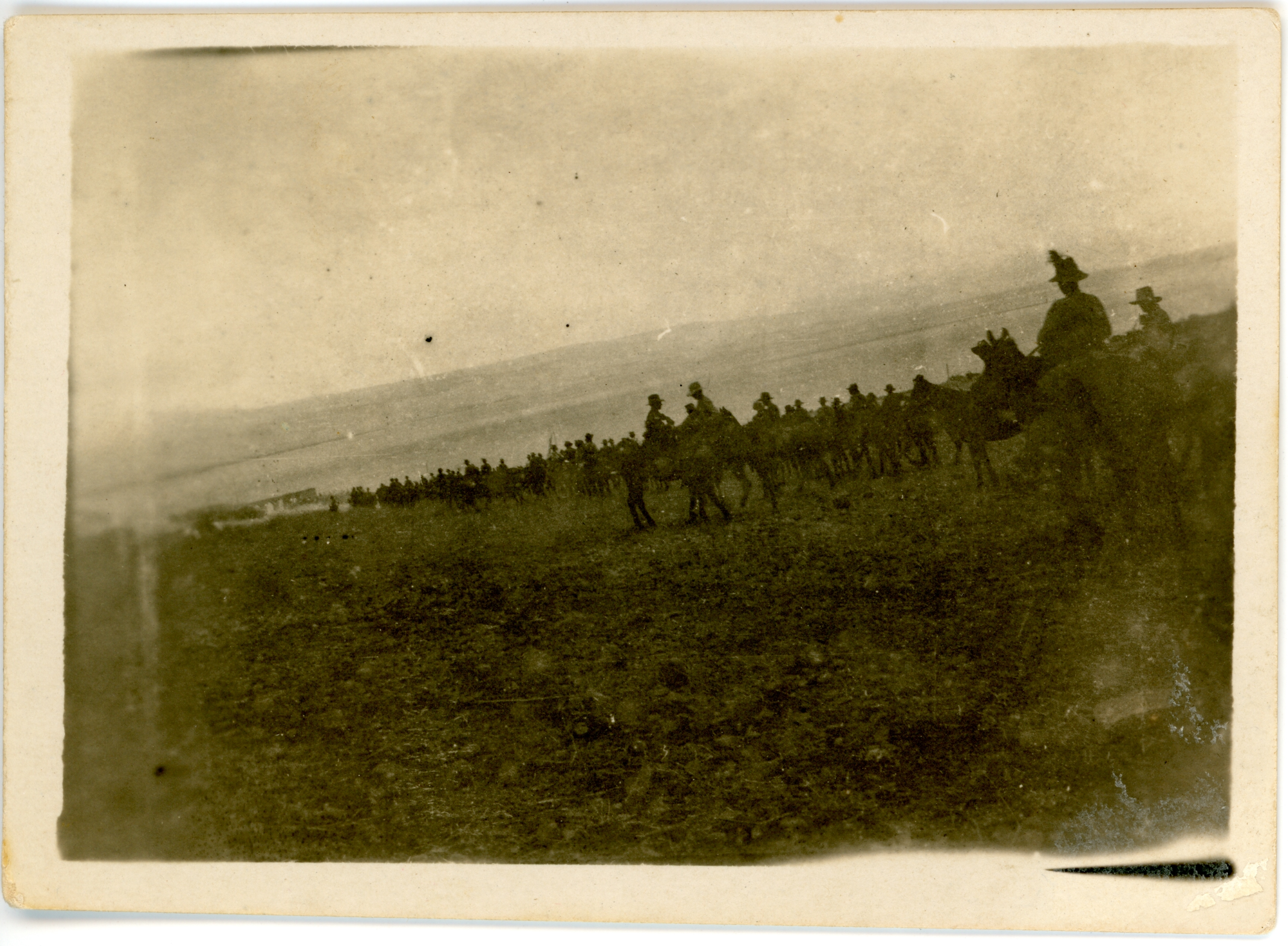 1918A small black and white photograph showing a group of mounted Light Horsemen riding along the side of a water body, which on the reverse of the photograph is identified as the Sea of Galilee. The terrain appears to be very rocky and, in the distance, there appears to be part of a bridge. The photograph has a small border and is in good condition, although the image does show many marks when enlarged. The reverse has part of the proforma printing for a postcard and a handwritten inscription in pen.