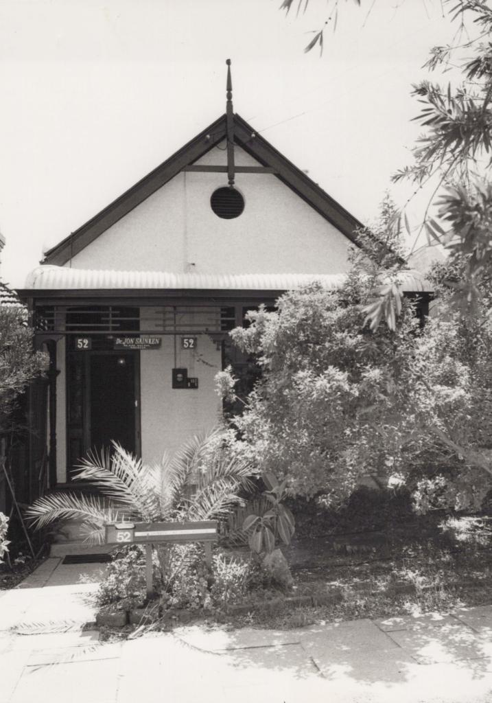 1985Black and white photograph of a house at 52 Churchill Avenue. The house is white. It has a pitched gable roof. There is a finial fixed to the top of the roof. There is a circular ventilation vent on the wall beneath the finial. There is a bull nosed verandah with a tin roof. There is a wooden decorative framework attached beneath the roof. Parts of the house, including the decorative framework and the finial, are painted in a darker colour. There is a sign attached beneath the framework reading 'Dr. JON SAINKEN'. The number '52' is seen on a sign attached beneath the framework on each side of the sign with the name. There is a post box attached to a wooden post in front of the house with the number '52' in white. There are bushes and trees to the right in the image partially covering the house.
