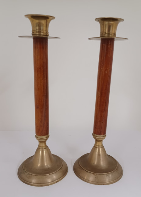 two tall candlestick holders - brass base, stem is wooden, and top part is brass which holds the candle in place