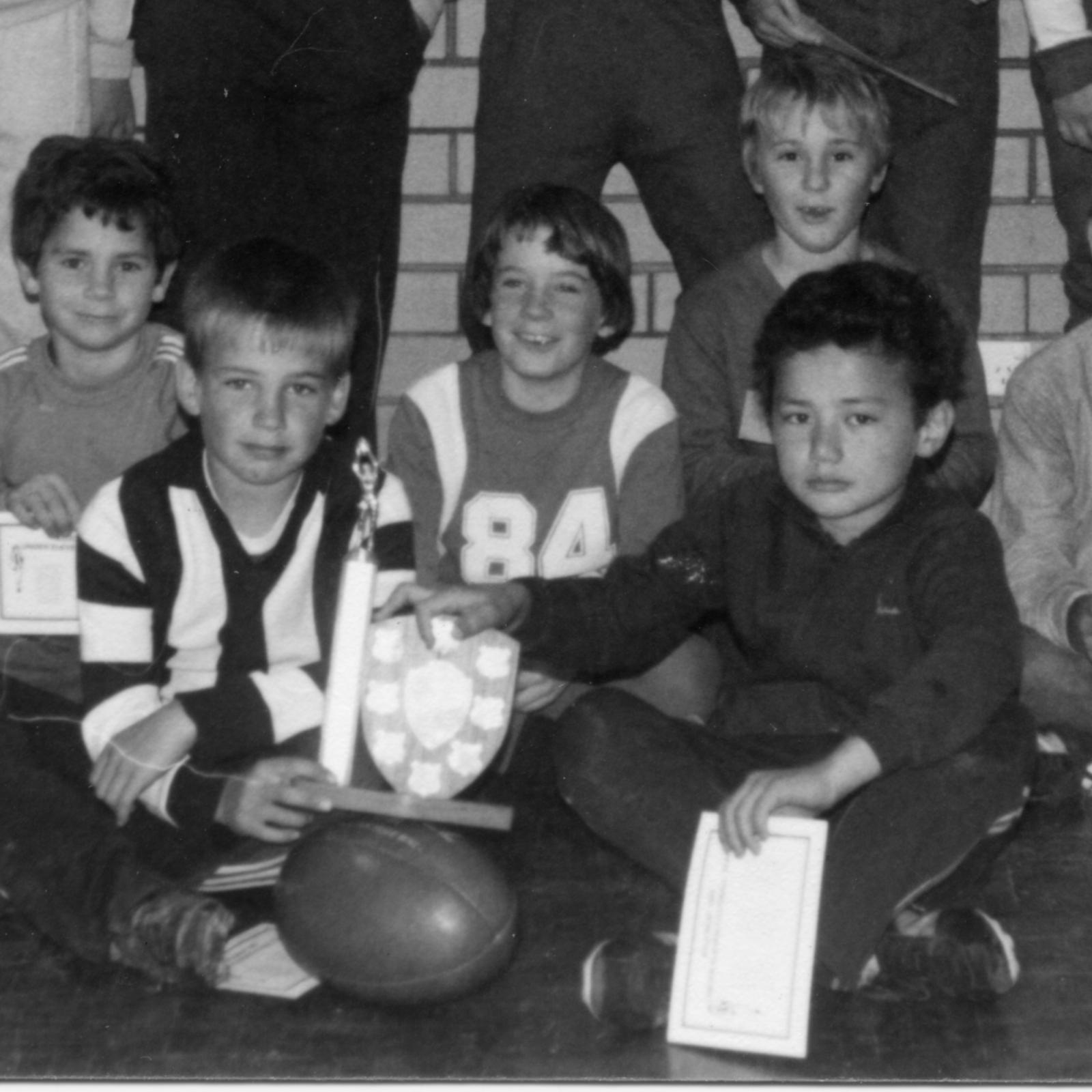 1985Junior Football Club 13/9/1985. This group were winners that year. Holding the shield is Peter Bell (closeup is photo (b), who became an AFL football player - see KPCW2026.12 for Peter's story history.