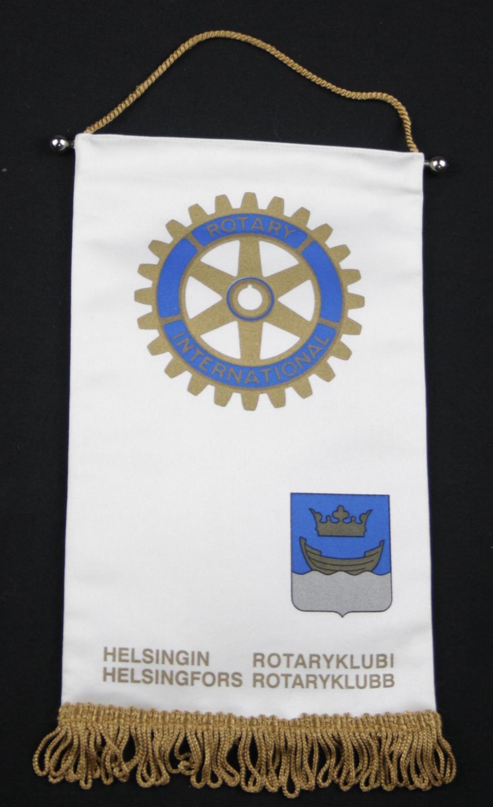 Gold coloured text is across the bottom edge of the pennant [ HELSINGIN ROTARYKLUBI/ HELSINGFORS ROTARYKLUBB]