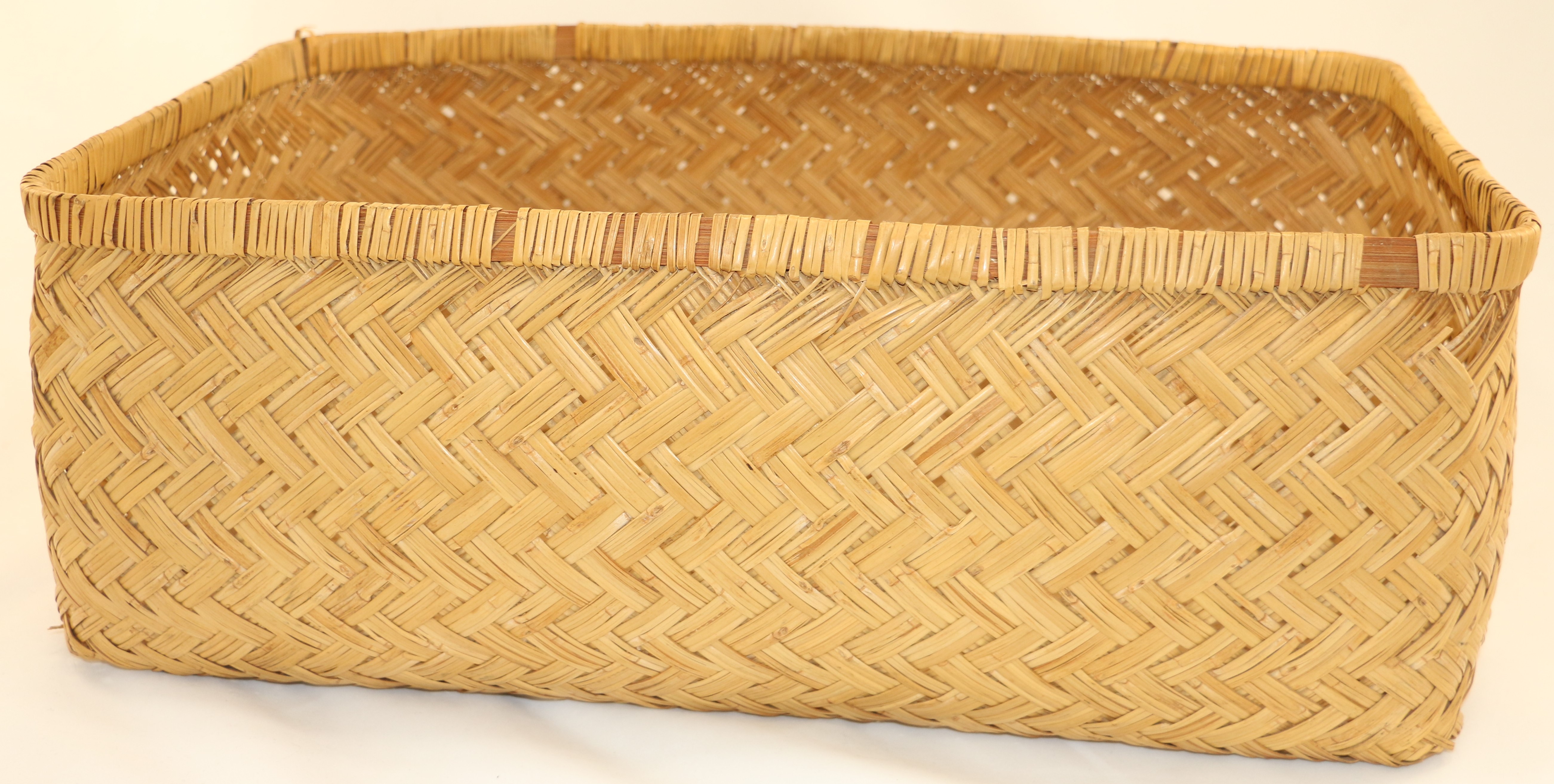 Split cane square basket with crisscross pattern on the sides and base and reinforcement around the top edge which is bound in cane.