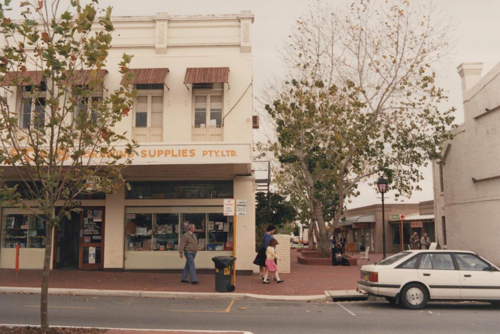 1988Coloured photograph showing an elevation of shops at 103 Rokeby Road. The buildings have verandahs and the shop names are seen on the verandahs. The shop '..? DRAWING SUPPLIES' is seen. A car is parked on the road. Some people are seen in the image. A few trees are seen in the image.