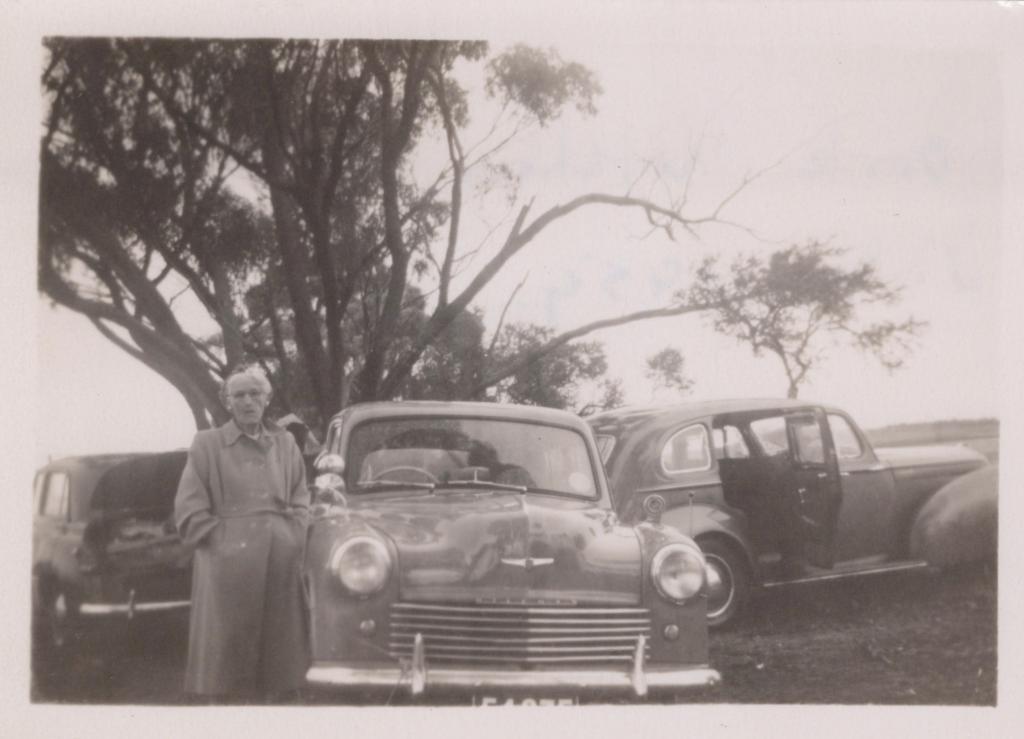 c. 1930Image: A photograph of what appears to be a woman standing beside a car. She is wearing a long dress, akin to a trenchcoat. In the background there are two other vehicles, and a large tree.