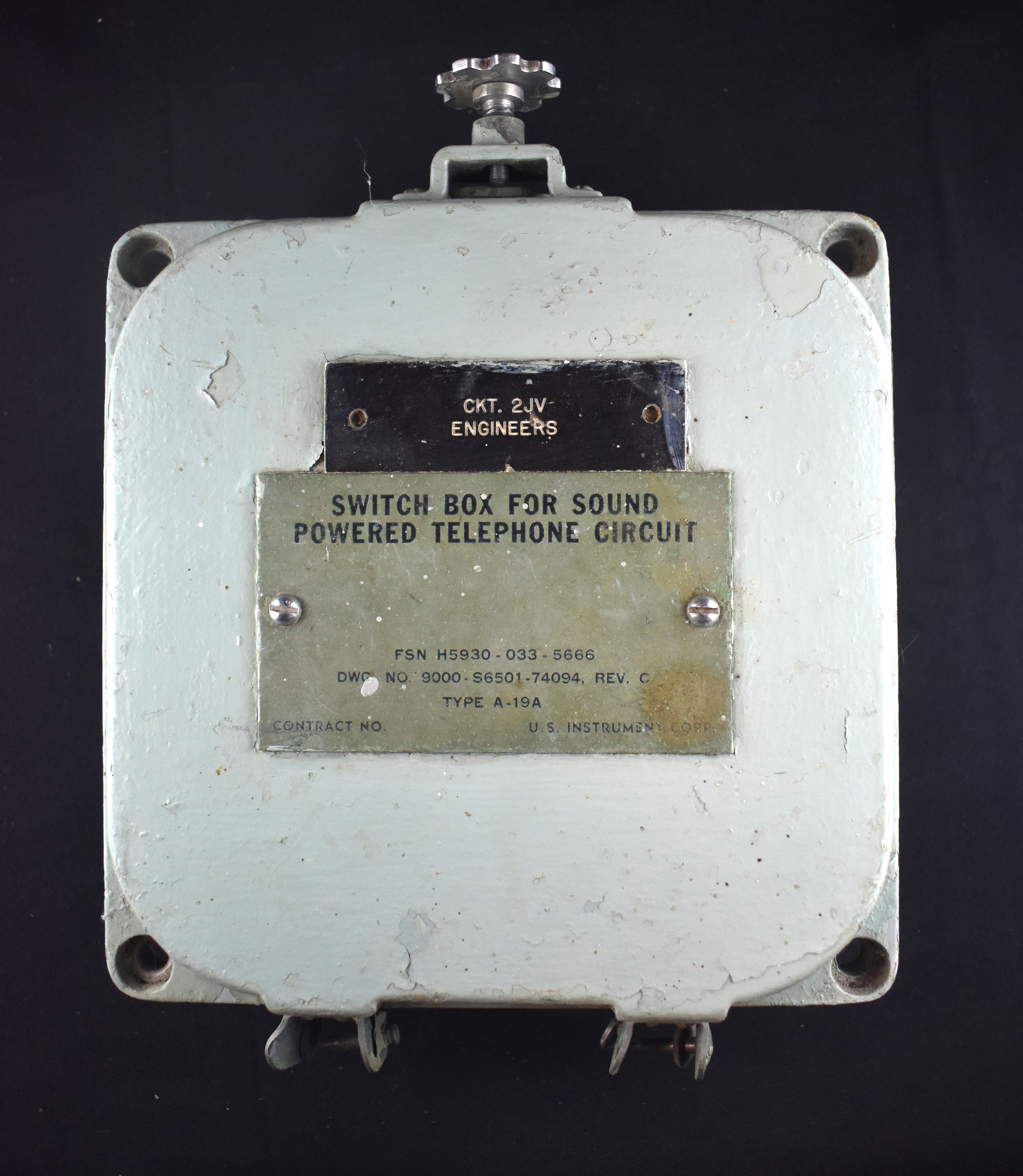 On front "CKT. 2JV / ENGINEERS" on small black plaque with "SWITCH BOX FOR SOUND / POWERED TELEPHONE CIRCUIT / FSN H5930-033-5666 / DWG. NO. 9000-S6501-74094 REV. C / TYPE A-19A / CONTRACT NO. / U.S. INSTRUMENT CORP." on large steel plaque. Inside are individual switches named "ENG RM #1 / ENG RM #2 / FIRE RM#1 / FIRE RM#2 / ENG OFFICE / IC&MG. RM / SHAFT ALLEY #1 / SHAFT ALLEY #2 / SMOKE WATCH / AIR COND. RM. / REFRIGERATION RM. / REPAI #5 / ENG. OFFICER S.R. / SENIOR RATE DINING HALL / F.O. FR. 51-OIL / F.O. FR 121-02-L / F.O. FR 55-01-L / F.O. FR 145 1ST PLAT / S.P. SWBD I.C. RM".