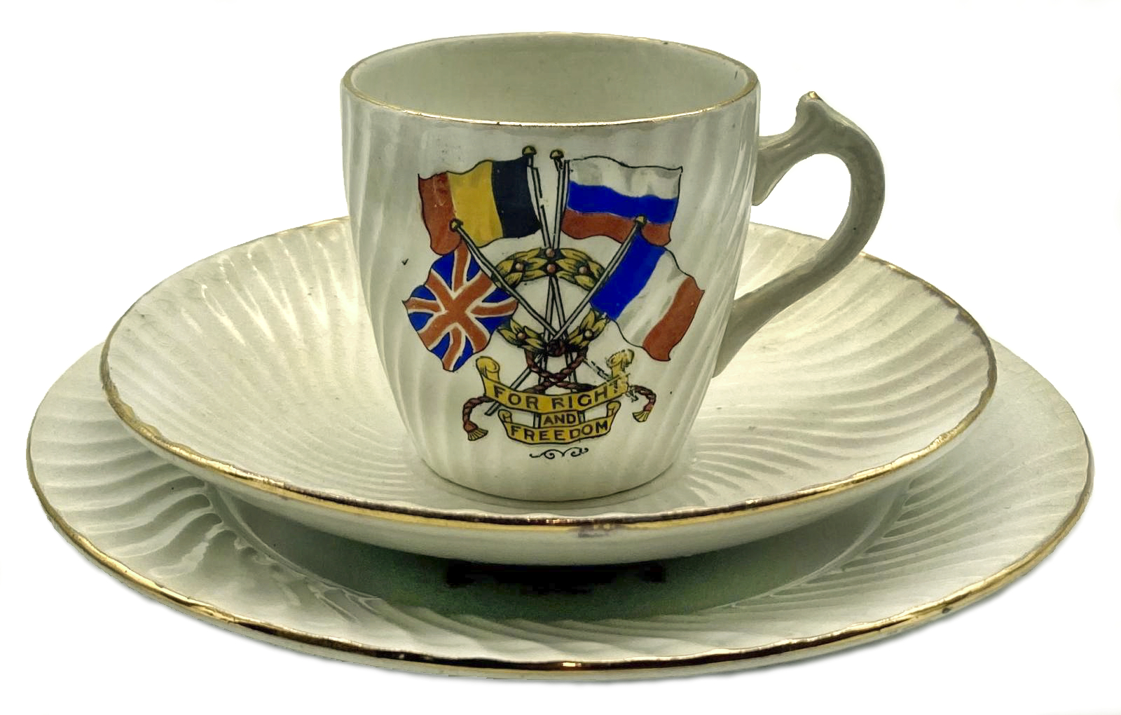 A patriotic cup, saucer and plate produced early in the Great War to show the solidarity of the allied nations in fighting a common enemy with a common purpose - For Right and Freedom.