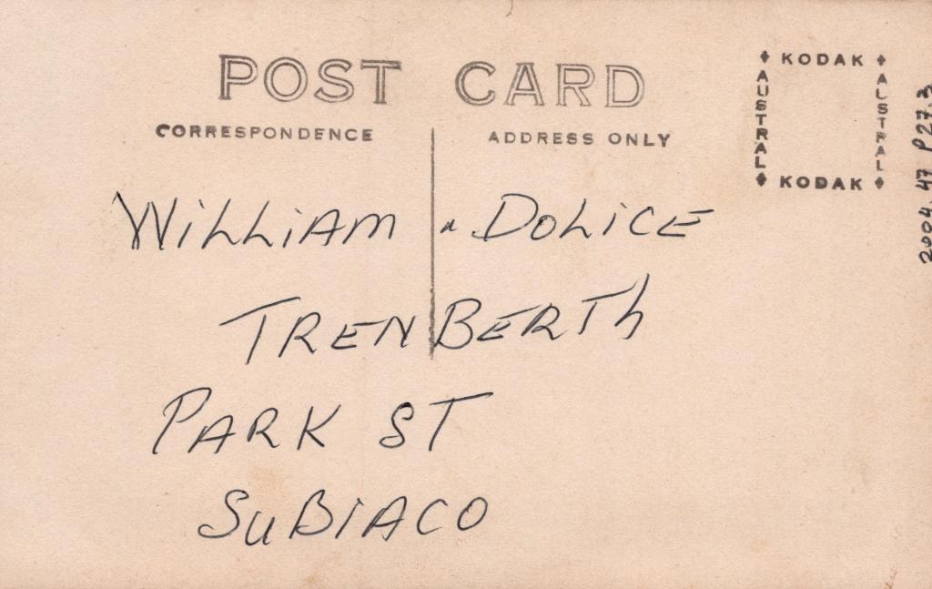 Reverse: Written in black pen 'WILLIAM & DOLICE TRENBERTH PARK ST SUBIACO'