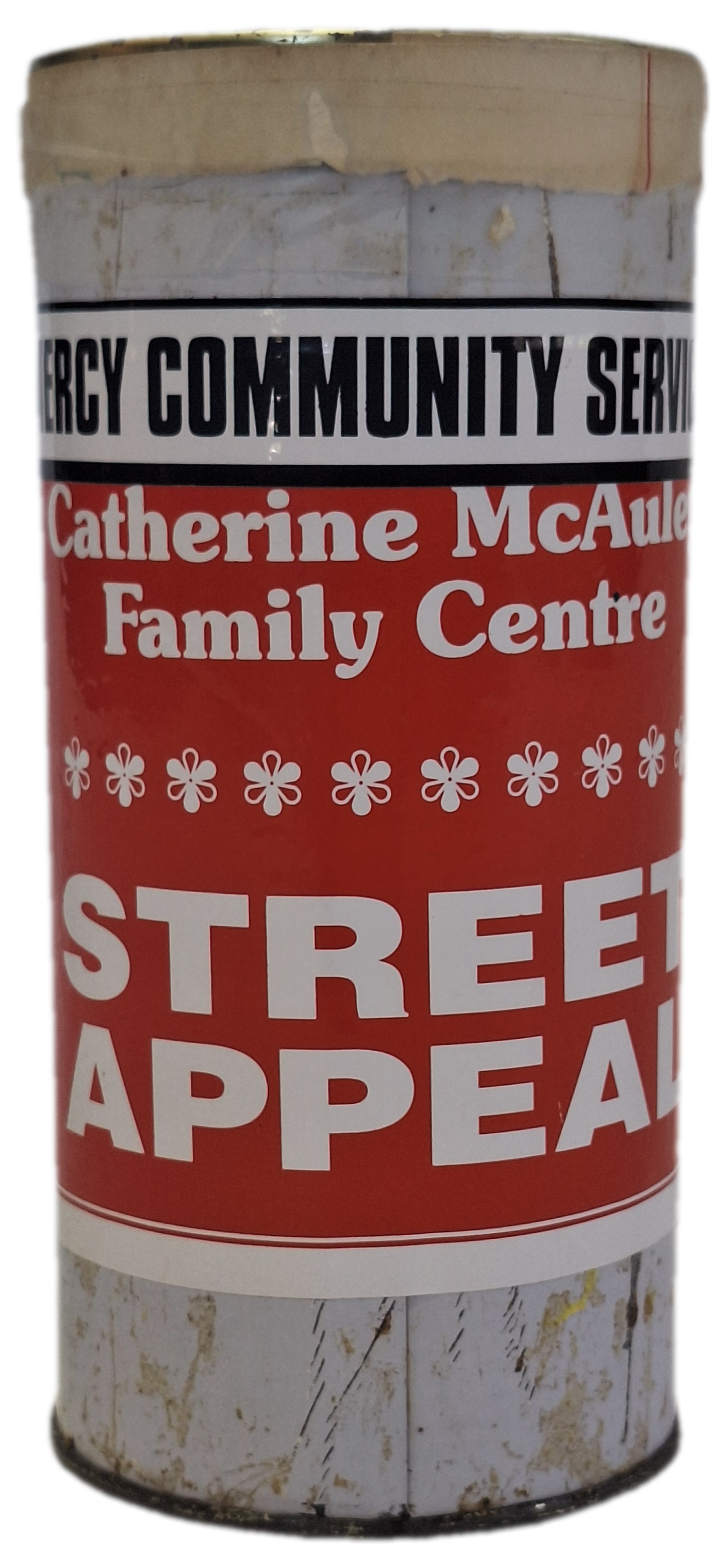 On tin: “Catherine McAuley Family Centre; Community Services; Street Appeal”. "880" number on bottom.