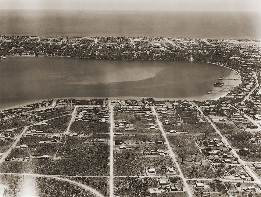 1929An aerial view of Freshwater Bay, encompassing parts of Dalkeith, Claremont ( including the baths and boat sheds), Peppermint Grove, Mosman Bay, Cottesloe and Rottnest Island.