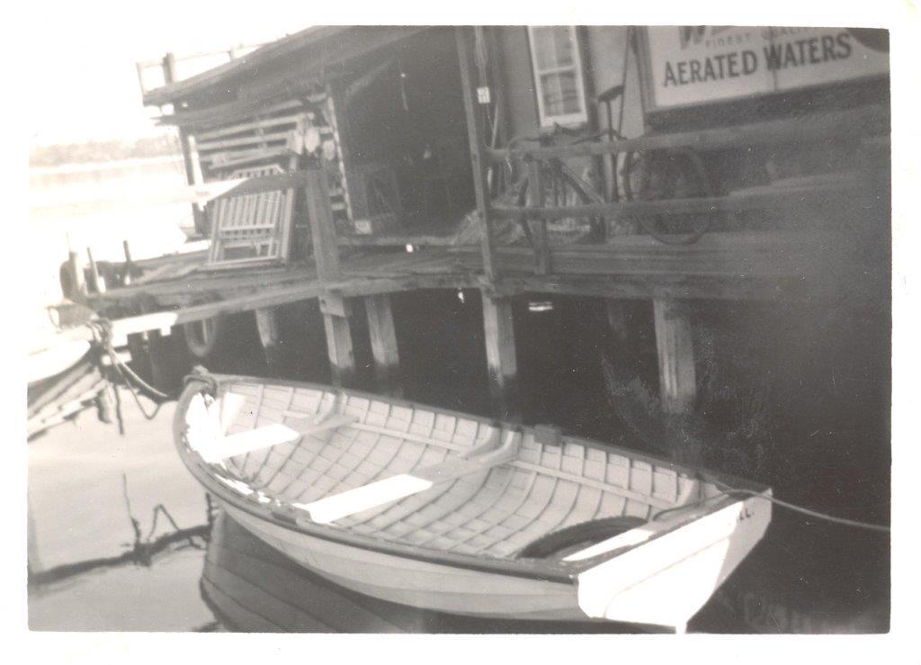 c. 1947B/W prints. (a) A white clinker built dinghy for hire tied to the front of the kiosk at the side of the jetty. (b) Seven hire dinghys anchored in the bay. Peppermint Grove foreshore in the background. (c) A wooden building on piles in shallow water. It has a corrugated iron roof with finials at each end, a metal chimney on the left and electric power bracket on the right. There is a full length verandah along the front and walkway with wooden guard rails. An advertising sign [GOLDEN/ WEST/AERATED WATERS] is on the front wall and two signs on the front rail [eat Peters ICE CREAM/ SERVED HERE] and [CLAREMONT/BOAT SHED/ BOATS BAIT FISHING TACKLE/ J A WIBBERLEY Tel 2564]. On the right end of the verandah is a lattice screen and cyclone gate, on the left a window in the living quarters.