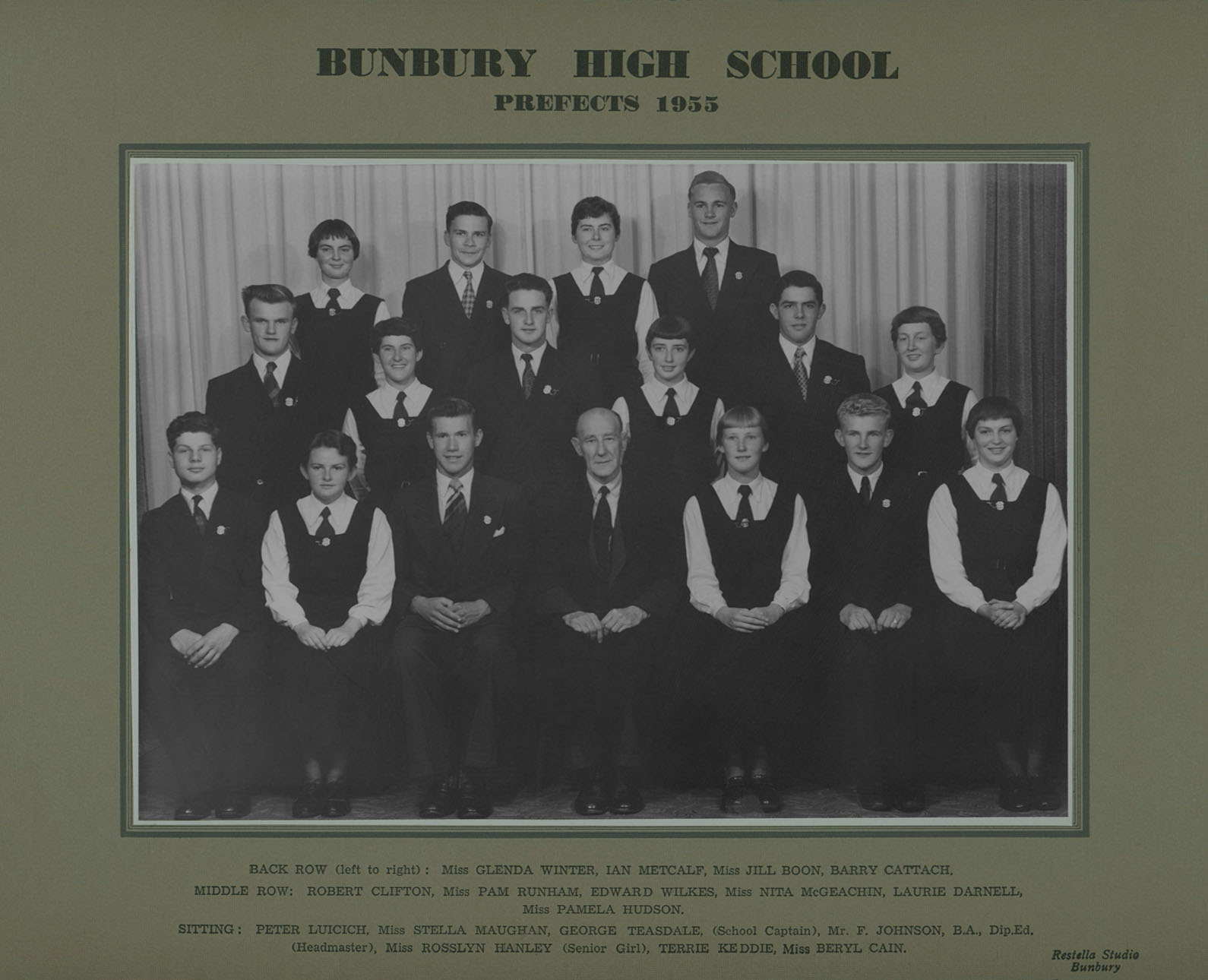 1955Studio portrait of the 1955 Bunbury High School Prefects with headmaster Frederick Johnson.