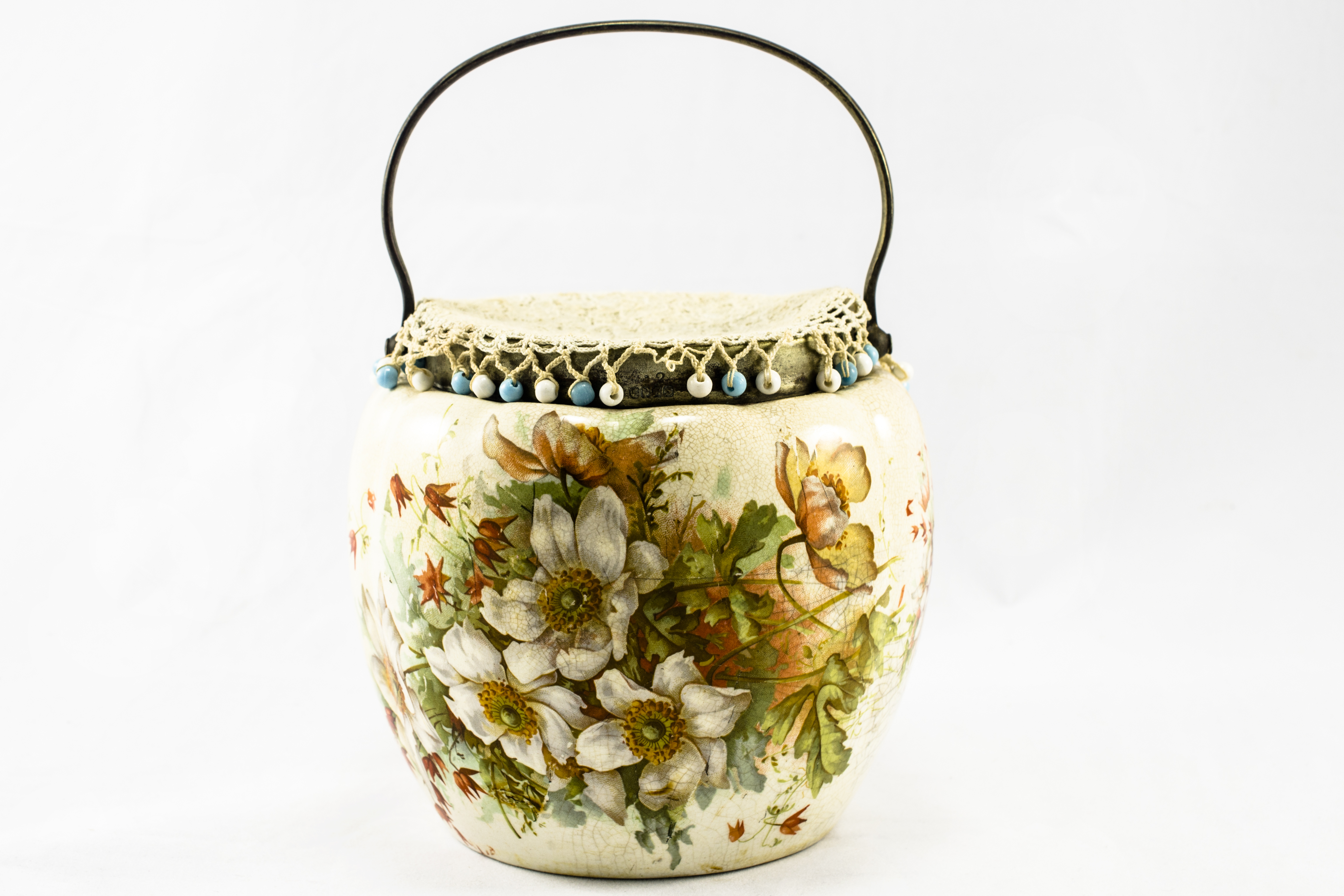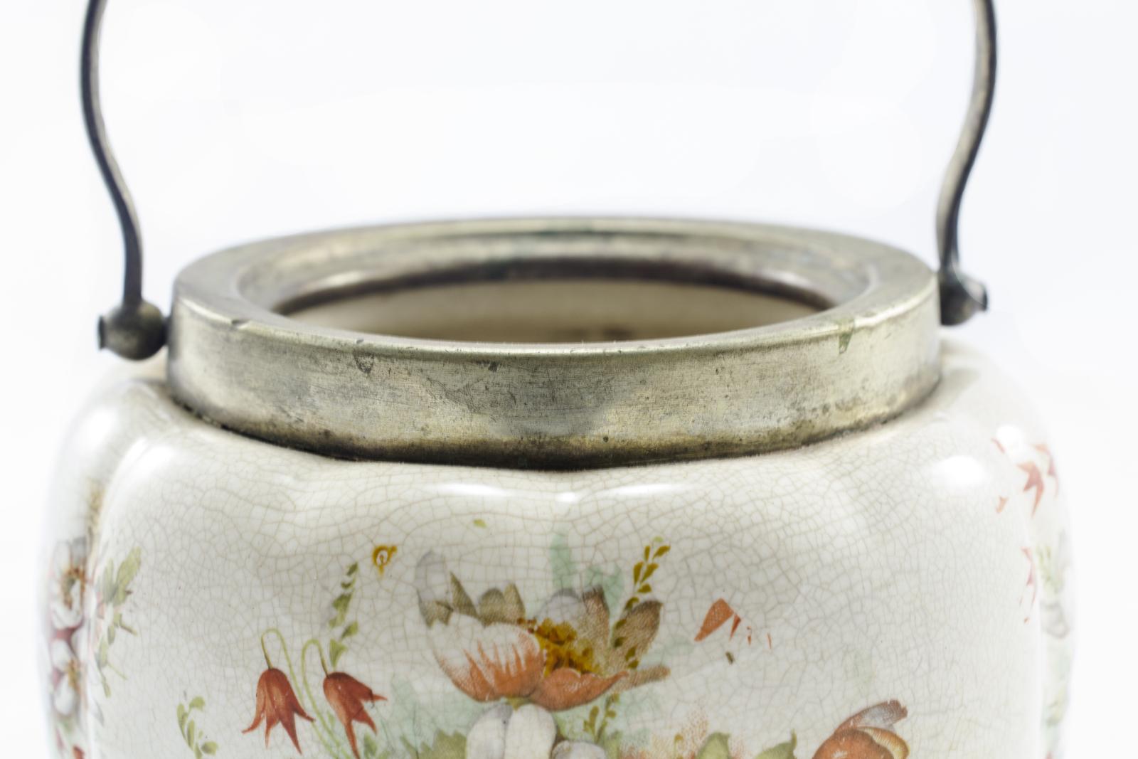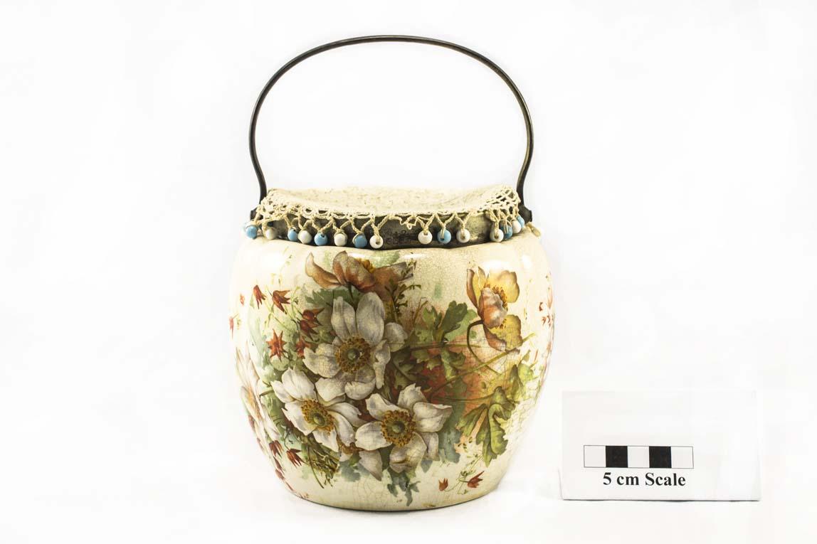 Silver plate rim on top and handle. Originally owned by Mrs Grace (John) Sim. There is no lid with this barrel. There is no lid with this barrel. This item has a jug cover which should be listed separately.