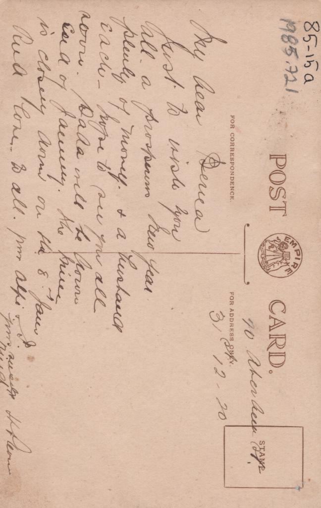 Reverse: Writer and addressee unknown: '70 Aberdeen Street, 31st.12.1920. My Dear Berica, Just to wish you all a prosperous New Year, plenty of money and a husband each - hope to see you all soon. Dada will be down end of January. Mrs Miller is closing down on the 8th Jan. With love to all from Alfie and I. Your sincerely '.