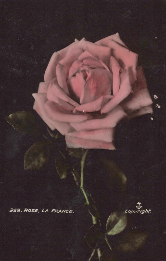 1920Postcard: Shows a light pink rose with a dark green stem and leaves against a shiny black surface. Printed in white underneath: 258. Rose, LA France, copyright.