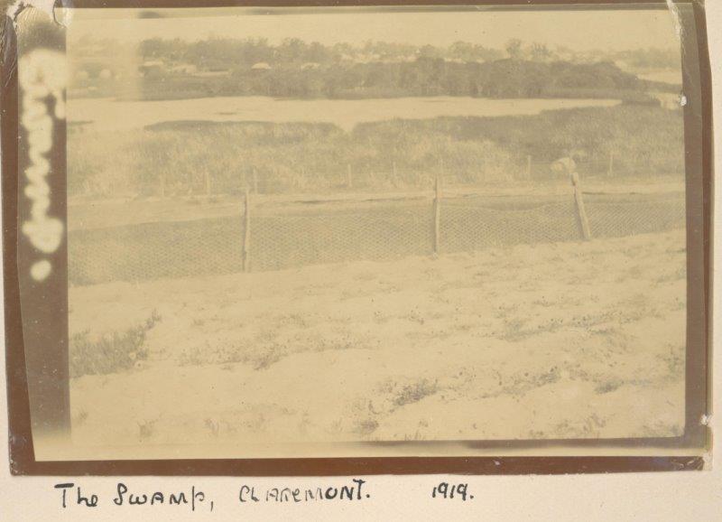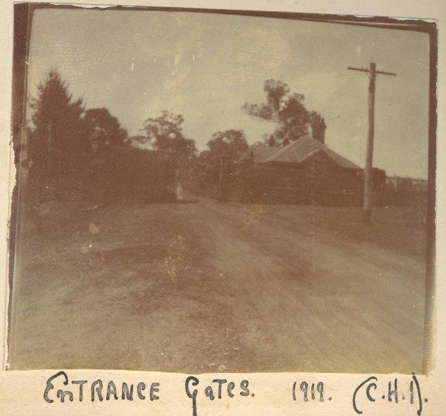 1919Four sepia prints. (a) Davies Road leading into the Claremont Hospital for the Insane. On the far right is an electricity pole and then the Lodge beside the gates.There are tall pillars and high iron gates, one of which is open. Large trees are inside the grounds.Printed on lower edge [ENTRANCE GATES 1919 (C.H.I.)] (b) The Administration building at the Hospital. A large two storey building, with stone ground floor and brick upper floor. On the right is a large palm. Printed on the lower edge [ADMINISTRATION BLOCK 1919] (C.H.I.)] (c) An iron roofed brick house with light bands around the brick work. A large central gable dominates the front and there two chimneys. Canvas blinds are partly rolled on the verandah, with creeper up the central posts, and shrubs and palms either side. There is a drive and lawn area across the front. Printed on the lower edge [ 'OUR HOME' 1919 (A.M.O. 'RESIDENCE) (C.H.I.)] (d) A view of Butler's Swamp across a grassed area to a post and wire fence, a cleared space then a second fence with plant growth, water and trees in the background