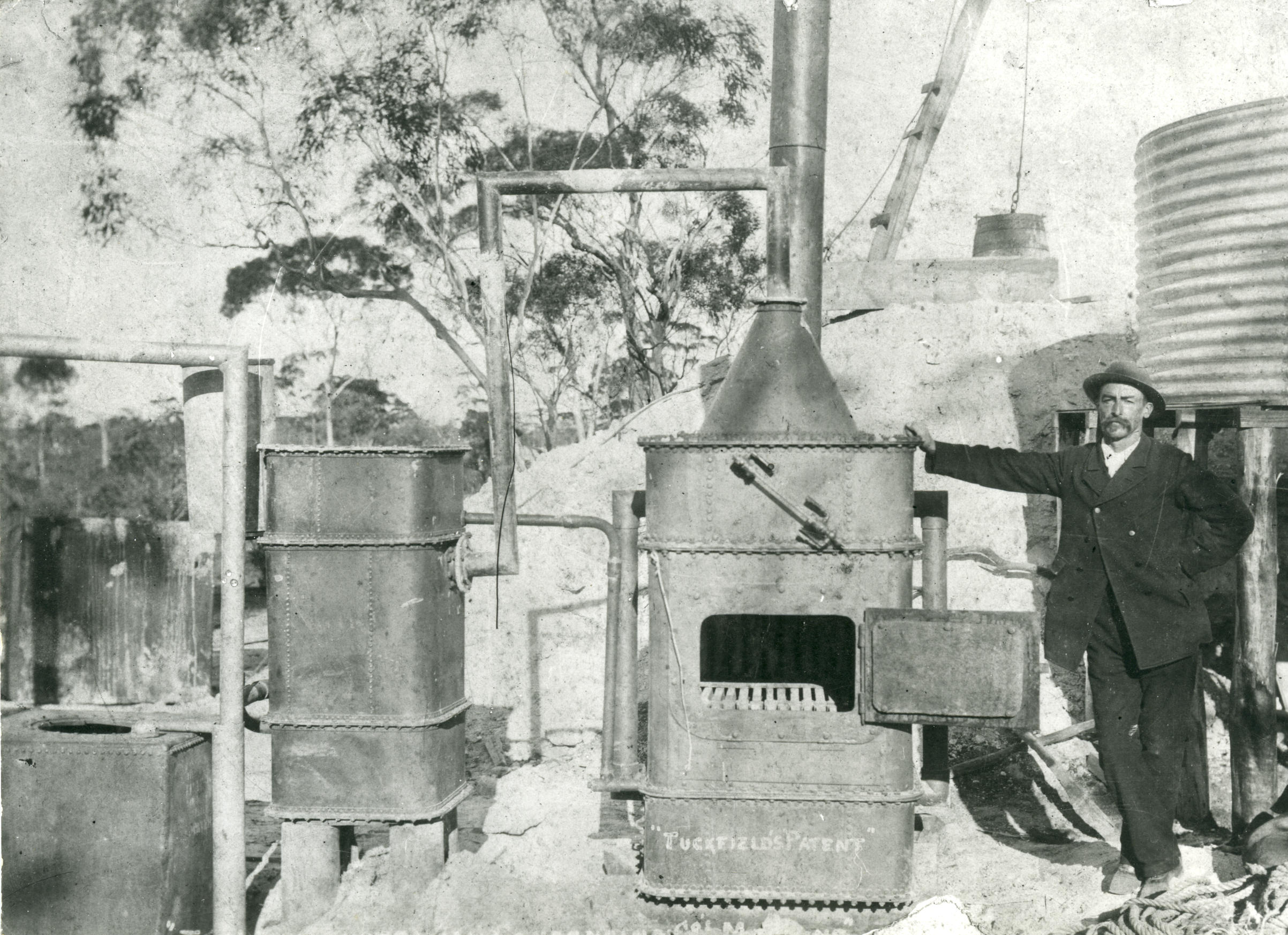 c. 1894Black and white reproduction of a sepia print showing the inventor, Charles Tuckfield, with his 1894 patent condenser plant working on the site of the Coolgardie Brewery.