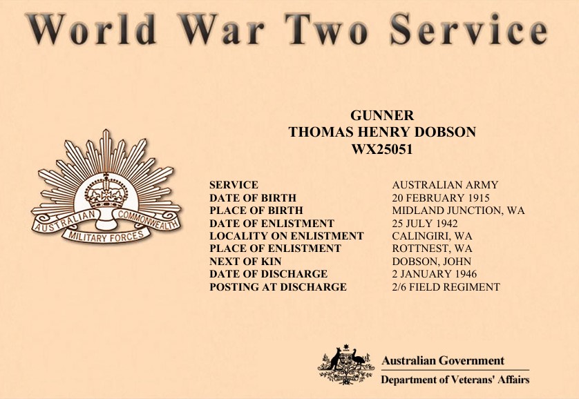Gunner Thomas Henry Dobson from Calingari was serving on Rottnest in 10 Garrison Battalion. He volunteered for AIF service as WX25051 on 25 July 1942 initially in 2/28 Battalion.