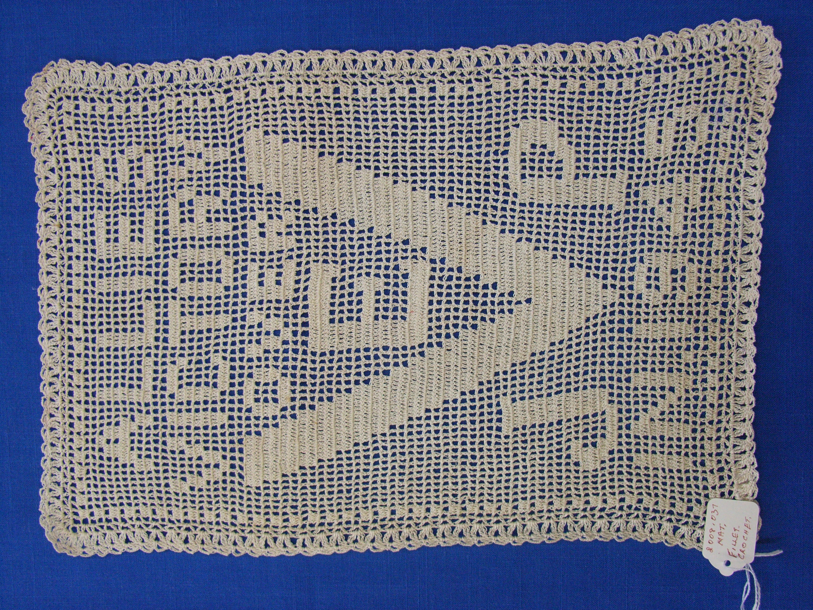 1945The mat is notable for the crocheted inscription 'ALLIES VICTORY OVER E.J.P. in 1945'. A large'V' has the initials E for Europe within it, 'J' for Japan at the left and 'P' for Pacific on the right.