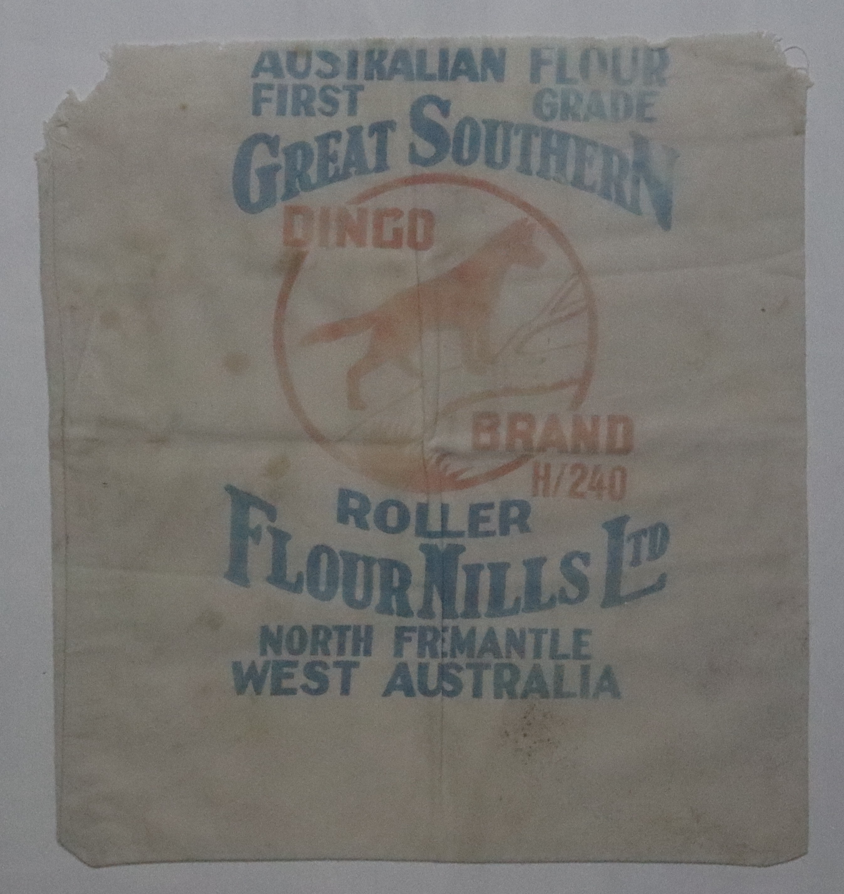 At the top of the flour bag in blue stamped lettering is "AUSTRALIAN FLOUR FIRT GRADE GREAT SOUTHERN".