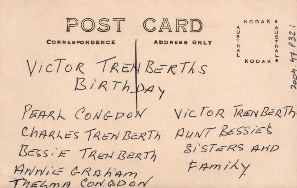Reverse: Written in black pen 'VICTOR TRENBERTHS BIRTHDAY PEARL CONGDON CHARLES TRENBERTH BESSIE TRENBERTH ANNIE GRAHAM THELMA CONGDON VICTOR TRENBERTH AUNT BESSIE'S SISTERS AND FAMILY'.