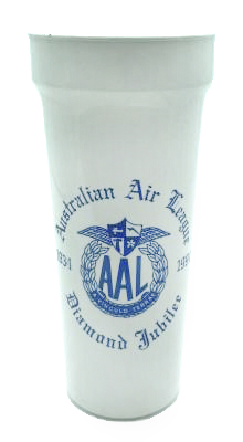 1994White plastic cup or beaker with dark blue writing celebrating the Diamond Jubilee of the Australian AIr League - 1934-1994.