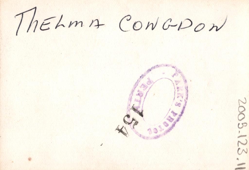 Reverse: Handwritten in black pen 'THELMA CONGDON'. Stamped on the back with a purple oval stamp reading 'PARK'S PHOTO PERTH' and a number '154' in black.