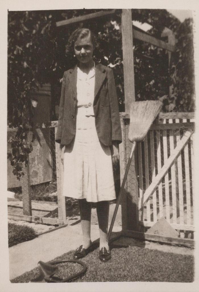 c. 1930Image: A photograph of Thelma Congdon as a young girl, standing on grass infront of a wooden fence. Leaning against the fence is a broom. Behind her is a wooden trellace like structure, with vegetation growing over it. She is wearing a white dress, and a dark coat over it. She wears dark enclosed shoes.