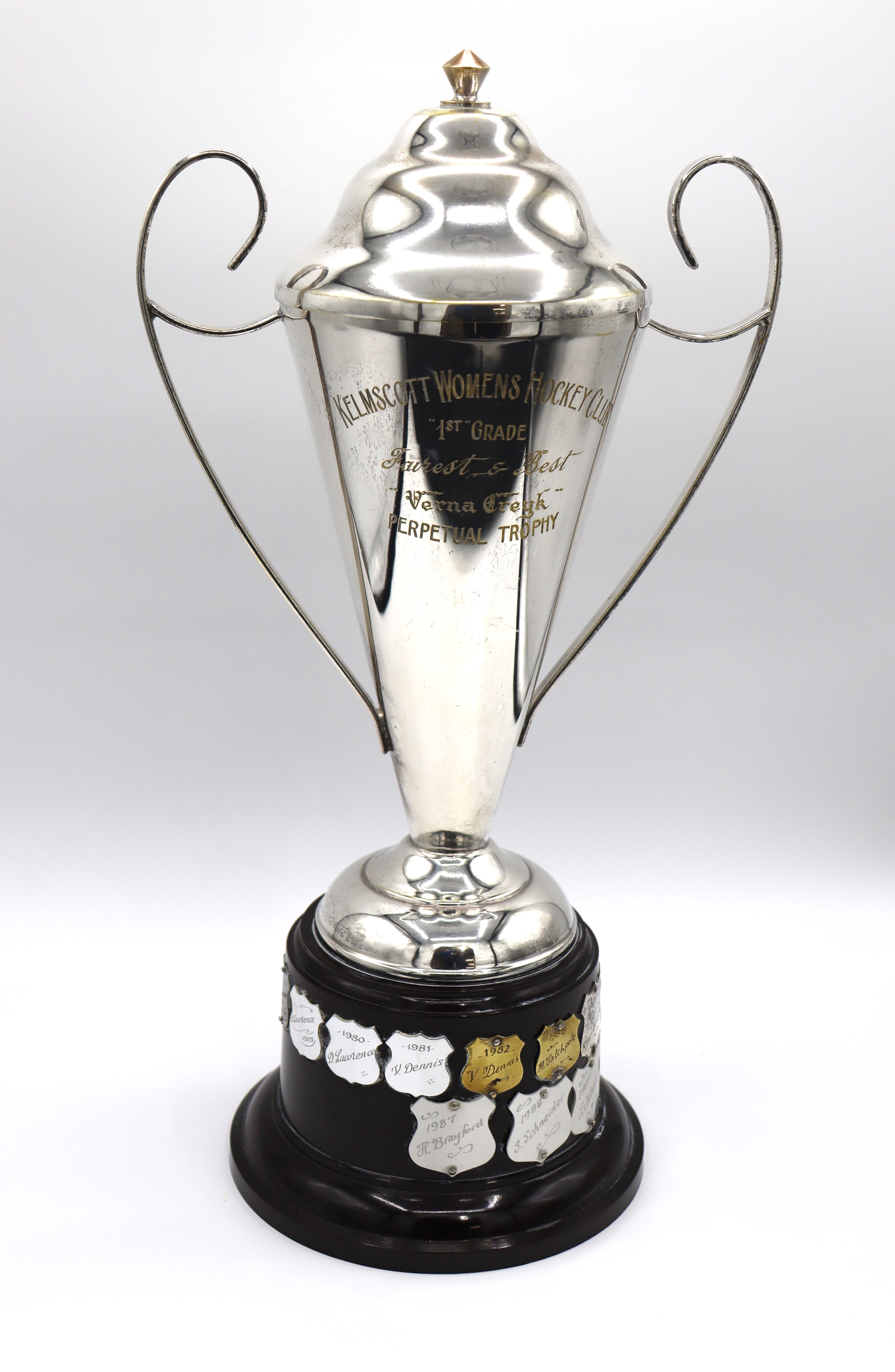 Engraved on the front of the cup is [KELMSCOTT WOMEN'S HOCKEY CLUB / 1ST GRADE / Fairest & Best / "Verna Creyk"/ PERPETUAL TROPHY].