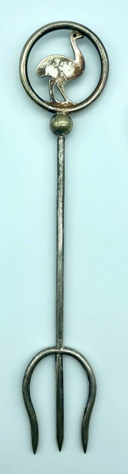This fork has a circular voided top with a central image of a standing emu, below which is a solid sphere and then a long thin shaft. The shaft continues to a point, either side of which is a curved tine of the same diameter, also ending in points.