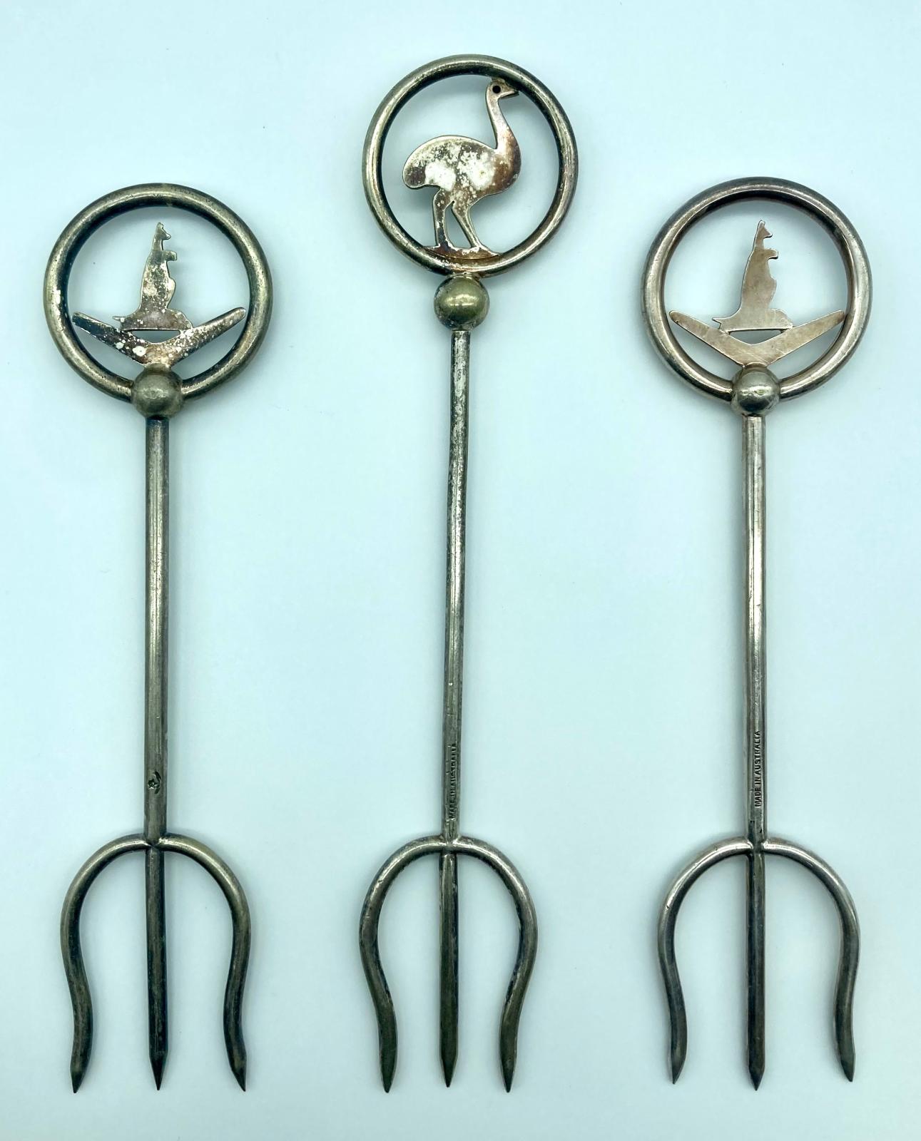 c. 1914One of a set of three EPNS silver plated trident bread forks featuring Australian native fauna.