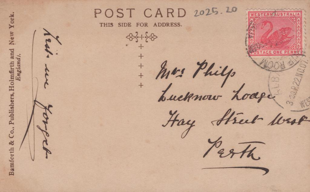 On the reverse it is addressed to 'Mrs Philp / Lucknow Lodge / Hay St West / Perth' with the words 'Lest we forget' written along the left short edge. There is a red postage stamp with a swan. There is a date stamp which reads '3.30.P.22.NO.07.'
