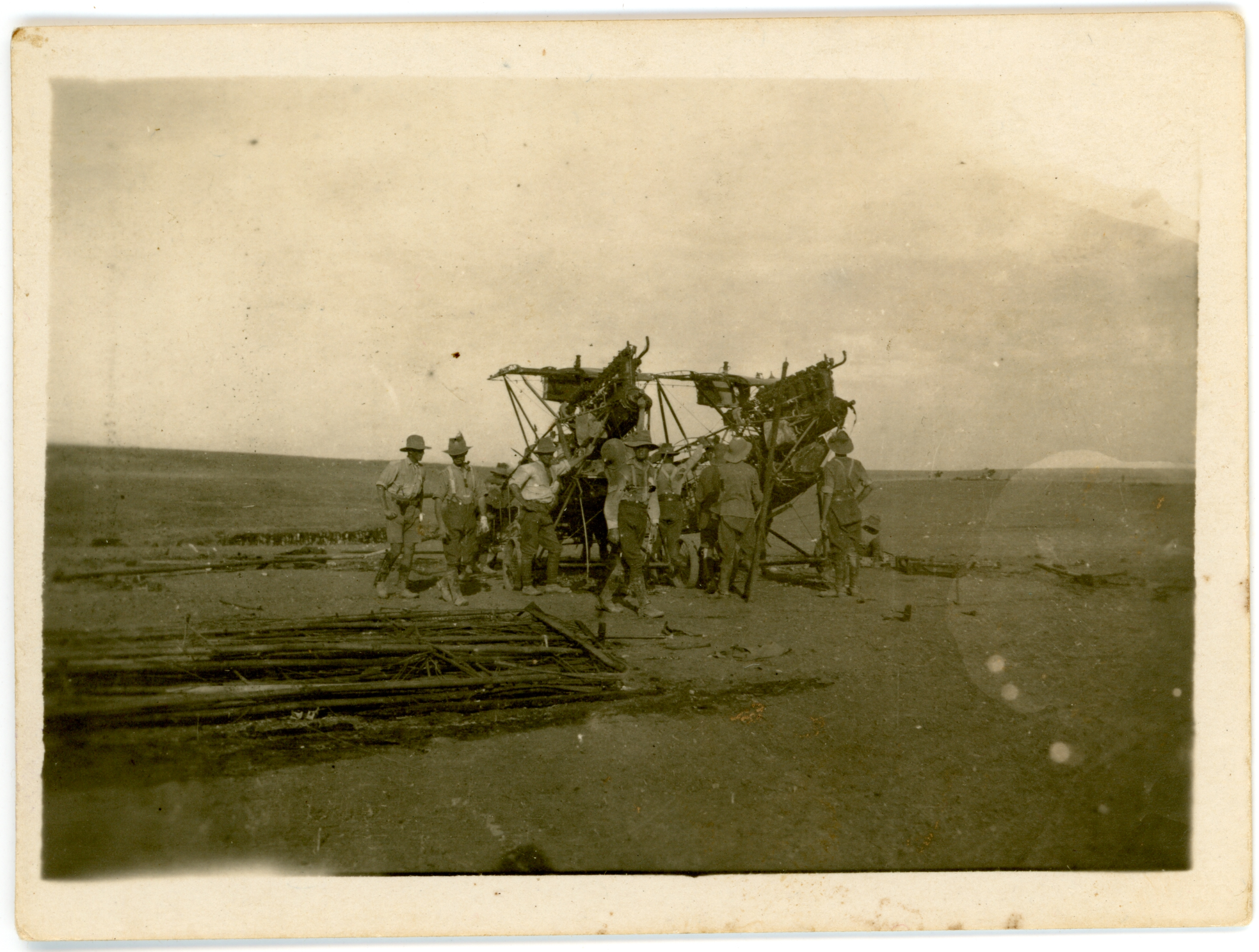1917A small black and white photograph showing nine Light Horsemen standing by the wreck of an airplane. Some of the troopers are examining the plane while others look to the camera. One other trooper is sat down at the side of the plane. Only a small amount of the carcass of the plane remains, although the position of its twin engines and its 4 landing wheels can be seen. There is a pile of wreckage on the ground in front of the plane that appears to be remnants of the wings. The photograph has a small border and is in good condition, although the image does show many marks when enlarged. There are also some effects from the development process. The reverse has part of the proforma printing for a postcard and a handwritten inscription in pen.