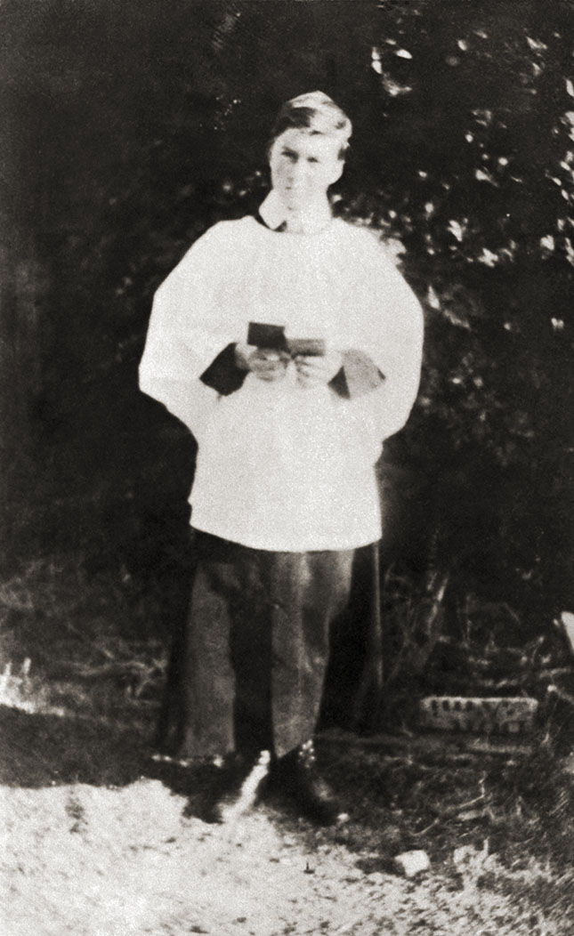 c. 1917Photograph of Frank Lane in Eton collar, cassock and surplice of choir boy, holding small open book. Garden setting.