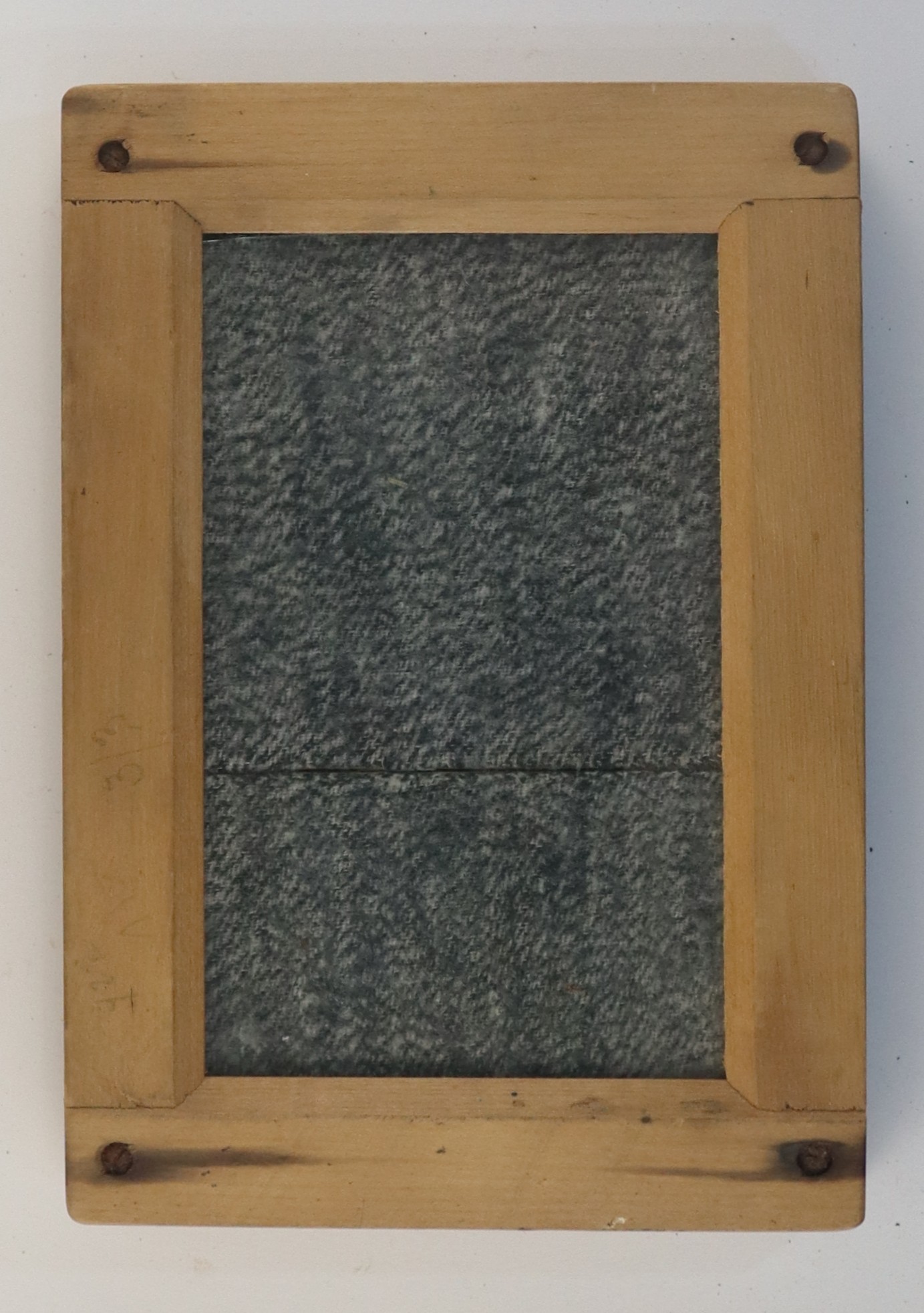 c. 1920 - 1929A rectangular shaped item with a wooden surround and glass in the centre. The back is wooden and there are metal straps at the back with a hinge so that the back can be opened. and back. There are screws in each corner.