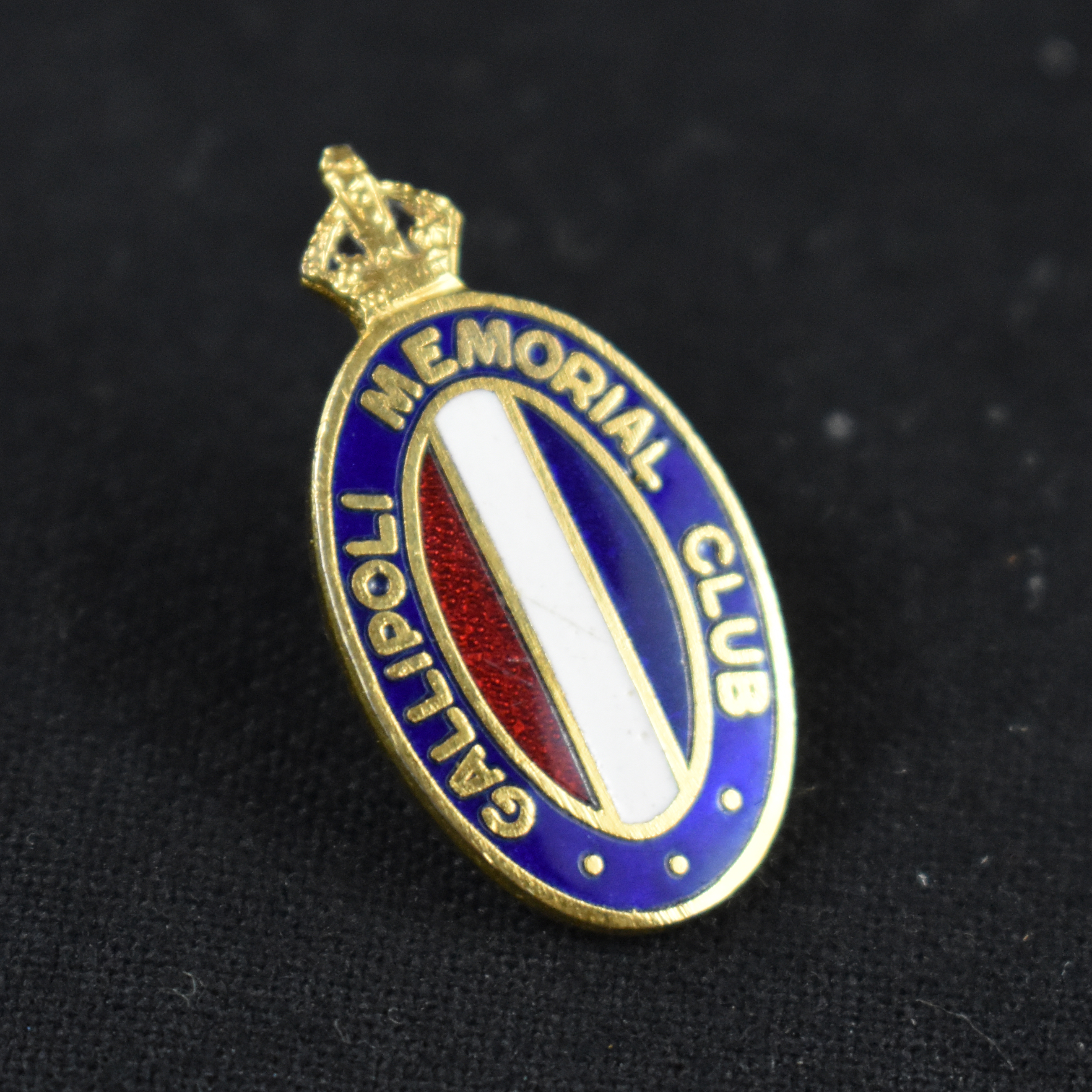 c. 1970Oval shaped yellow metal lapel pin with royal crown atop. Blue enamel with words “Gallipoli Memorial Club” embossed on edging and strips of red, white and blue enamel in centre of pin. Screw clasp on back to secure to clothing and issue number of "2247".