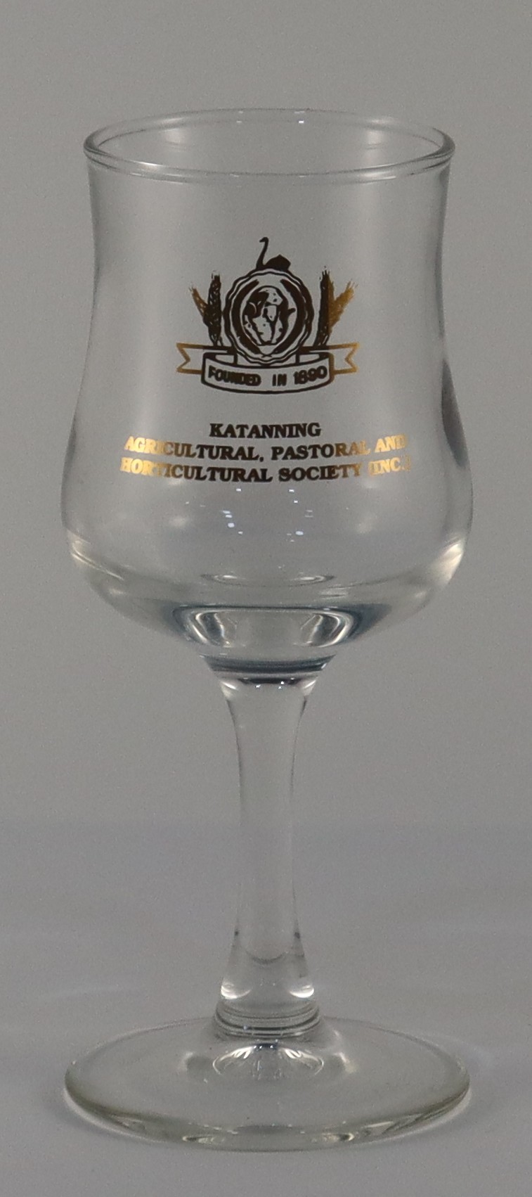 A short stem liqueur glass. On one side of the glass is the a gold circle which has a fluted edge, in the centre is a etched ram's head and on either side are etched stalks of grain. Above the circle is a swan and either side of the circle are standing kangaroos. Below this logo is a ribbon scroll. This logo is the "Katanning Shire Crest"
