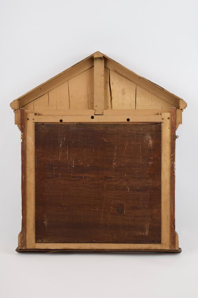 Wooden honour board in the shape of a clasical architecture façade with a central face, two columns etither side and a triangular pediment on top.