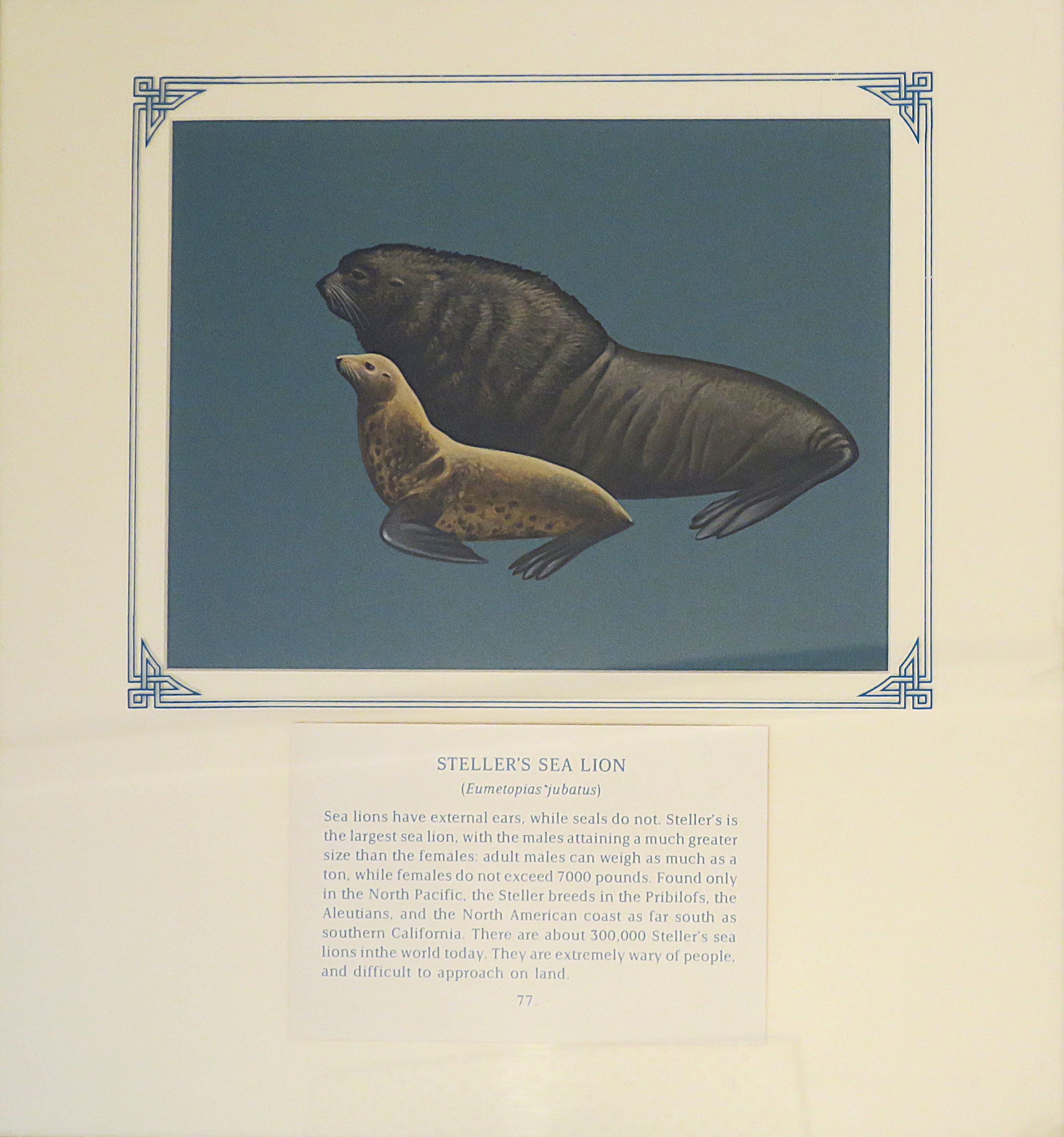 Sea lion's have external ears, while seals do not. Steller's is the largest sea lion, with the males attaining a much greater size than the females: adult males can weigh as much as a ton, while females do not exceed 7000 pounds. Found only in the North Pacific, the Steller breeds in the Pribilofs, the Aleutians, and the North American coast as far south as southern California. There are about 300,000 Steller's sea lions inthe world today. They are extremely wary of people, and difficult to approach on land.