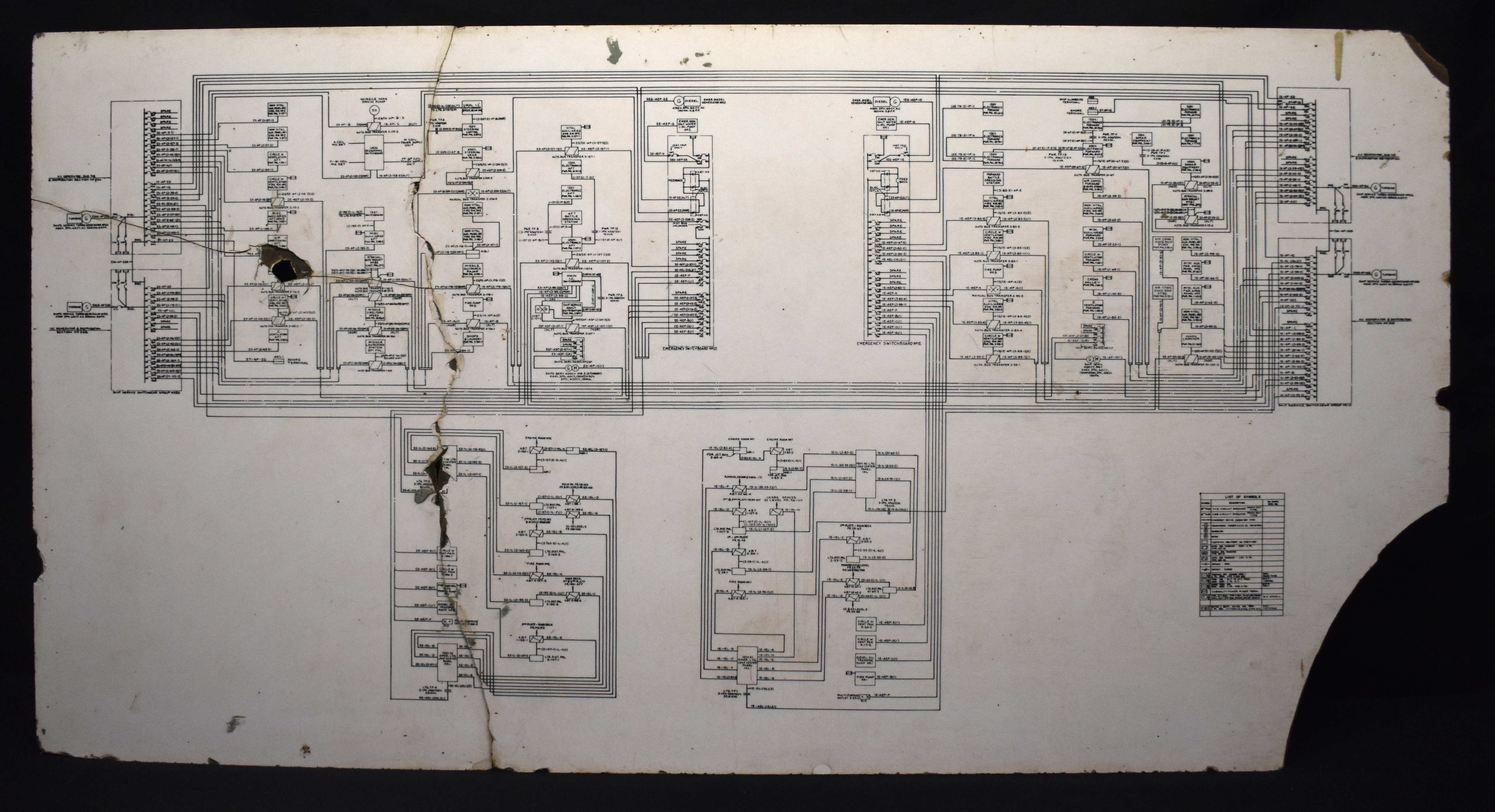 c. 1965A rectangular white plastic sign with black text with diagrams.