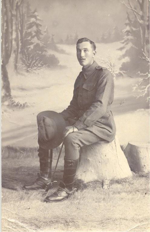 Studio portrait of Reginald (Rex) Liggi, a dark haired young man with a moustache, photographed sitting on a log against a studio backdrop. He is in full uniform, with leather leggings and spurs and holding his whip and hat which has the feathers of the 10th Light Horse Regiment attached. Hand written on the back in indelible pencil [To/ Mum & Mabs/ with best of wishes/ from/ Reginald Legge/ 4/12/16]