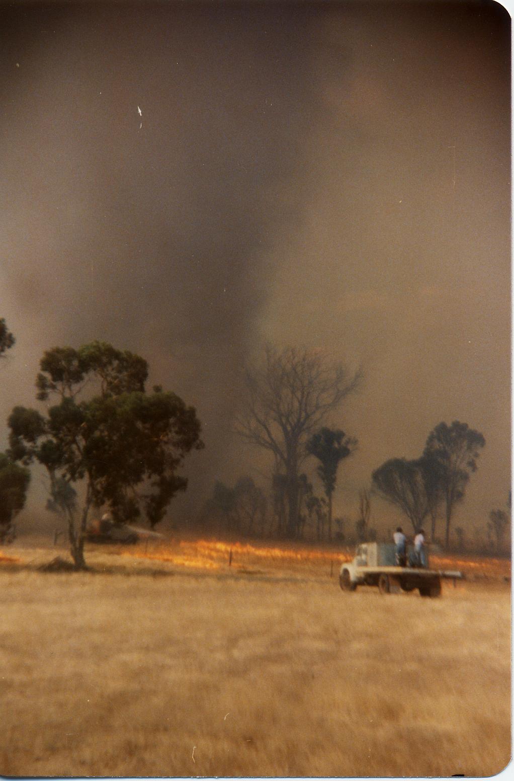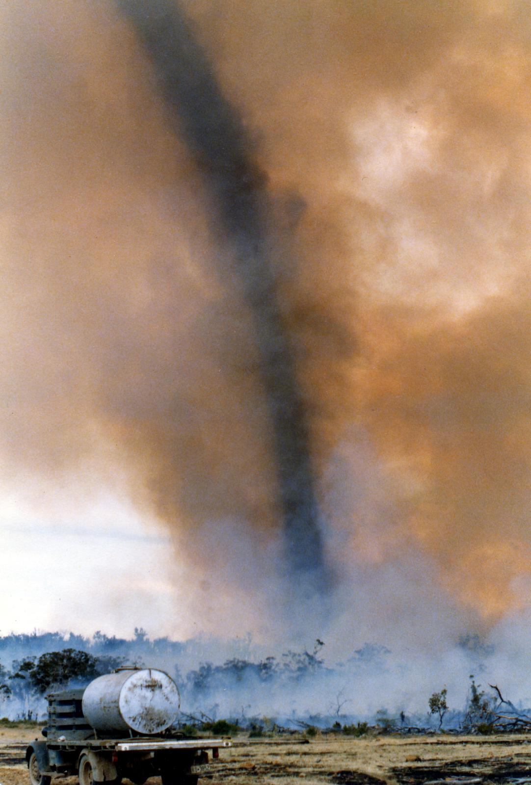 b.) A severe 'willy-willy' caused by an updraft during a bush fire. Volunteer's fire fighting unit in the foreground.