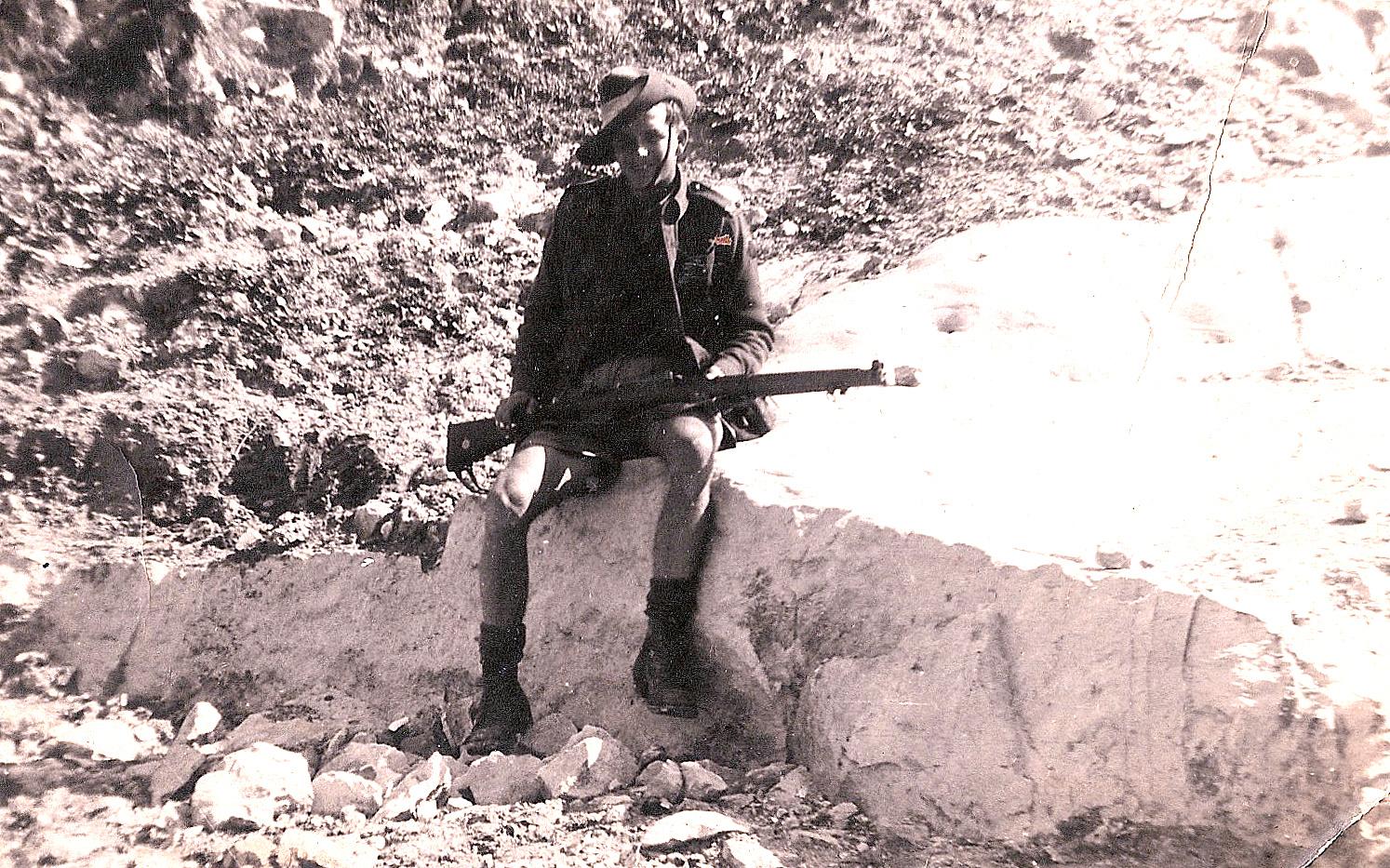 1940Informal portrait of unidentified soldier sitting on a rock