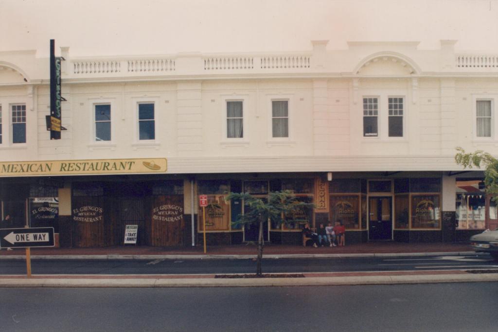 1988Coloured photograph showing an elevation of the Rogerson Building at 1 Rokeby Road. The Rogerson Building is located on the corner of Rokeby Road and Roberts Road. The shops 'EL GRINGO's MEXICAN RESTAURANT' and 'ALOHA' are seen at the ground floor of the building. A few people are seen sitting on a bench in front of 'ALOHA'.