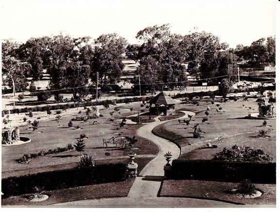 c. 1910The Grange looking down to the Perth-Fremantle Road. Curved terrace and hedge with winding path leading down and encircling gazebo. Opening in hedge marked by urns on pillars. Sloping lawn dotted with garden beds, young trees, rustic seat and a lawn mower. A hedge is starting to grow along decorative picket fence on road side. Power and telegraph poles and lines mark the road, with man on a two horse lorry. Open bushland including tall tuart trees in the background.