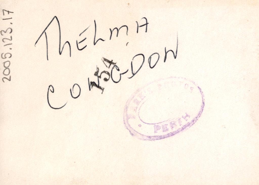 Reverse: Handwritten in black pen 'THELMA CONGDON'. Stamped on the back with a purple oval stamp reading 'PARK'S PHOTO PERTH' and a number '154' stamped in black.