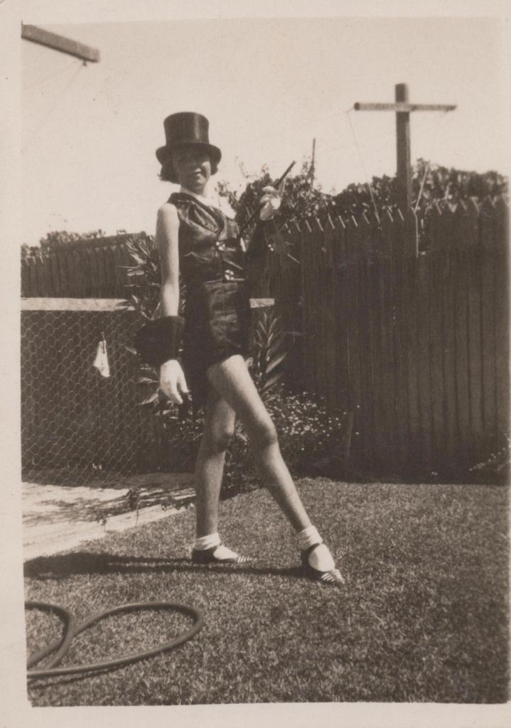 c. 1930Image: A photograph Thelma Congdon as a young woman standing on grass, infront of a wooden wire fence, and a taller wooden fence. Behind the fence is the top of a powerline. She is posing with one leg stepping out infront of her. She wears a silky black vest and silky black shorts. On her head is a black tophat. She is wearing white socks, and dark shoes with a strap over the top of her foot.