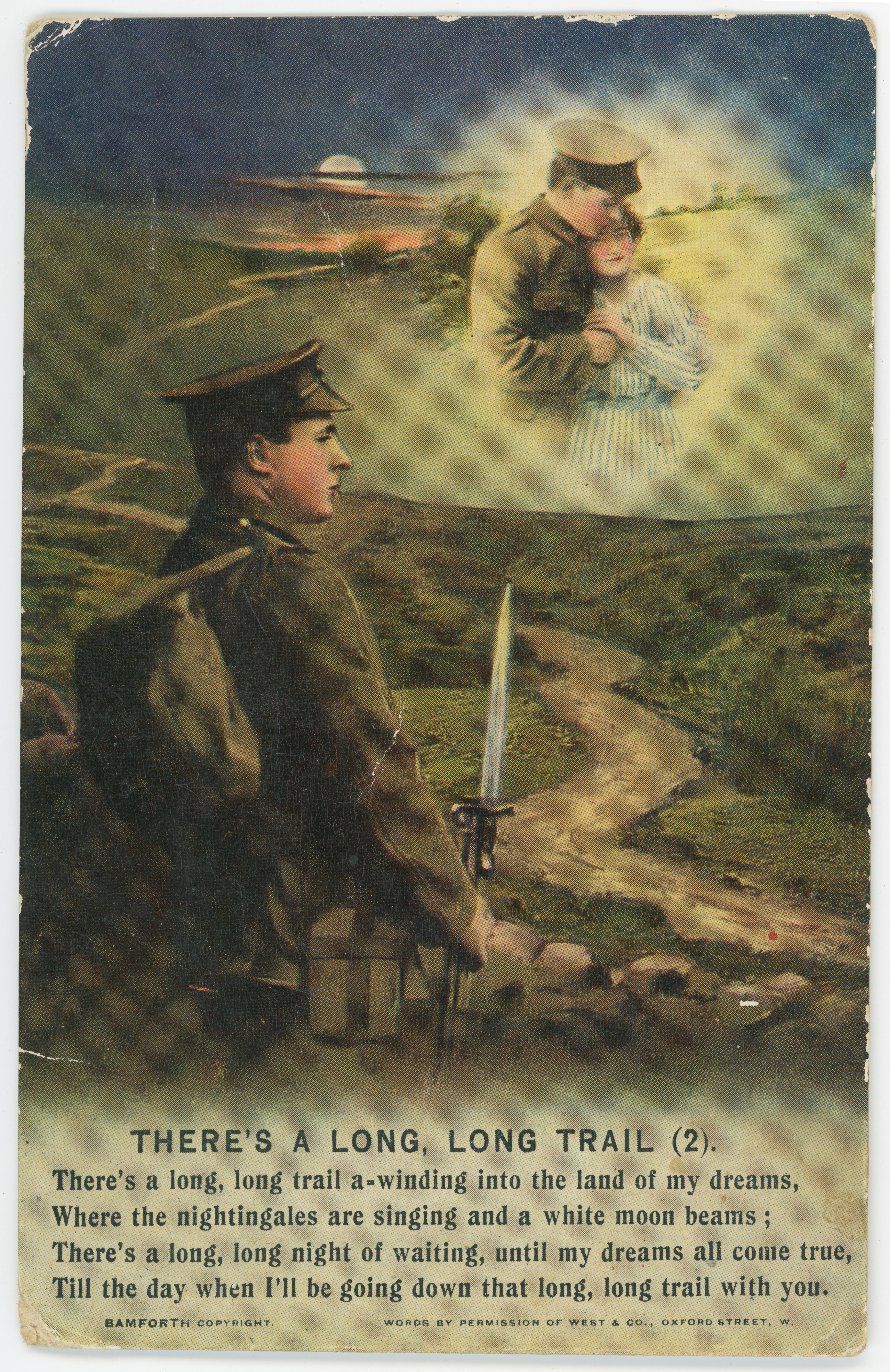 c. 1917A coloured postcard with images and lines of the chorus of a song in black ink below the images. In the mid ground is a landscape showing hills and tracks with a lone soldier gazing into the distance. He is wearing Army uniform and carries a knapsack, water bottle and a rifle with a fixed bayonet. Above this image the same soldier is featured with his head bent down and one arm around a young woman who is leaning into him while he is holding her hand. They are in an open field with bushes and trees in the distance, along with a track and a white setting moon. A pale heart shape encompasses the pair.